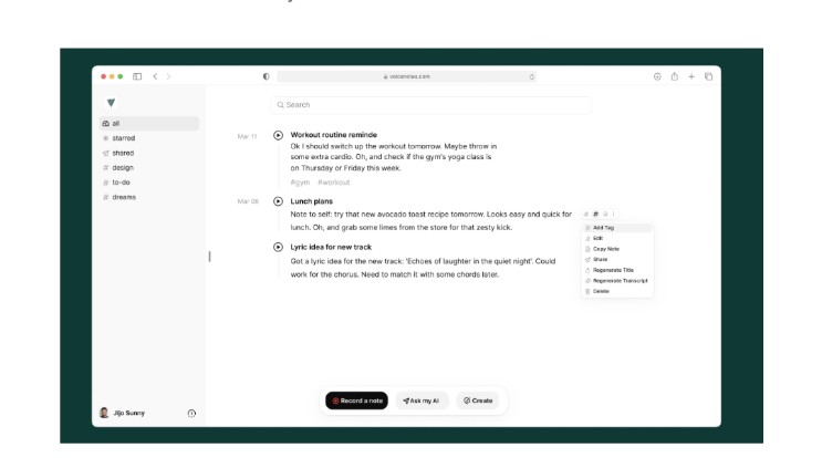 Once you're done recording, the power kicks in. Edit, tag, and even use AI to suggest titles for your notes. Want to repurpose your note? Voicenotes can transform it into a blog post, tweet, to-do list, or email with a few clicks. It can even summarize key points for you!