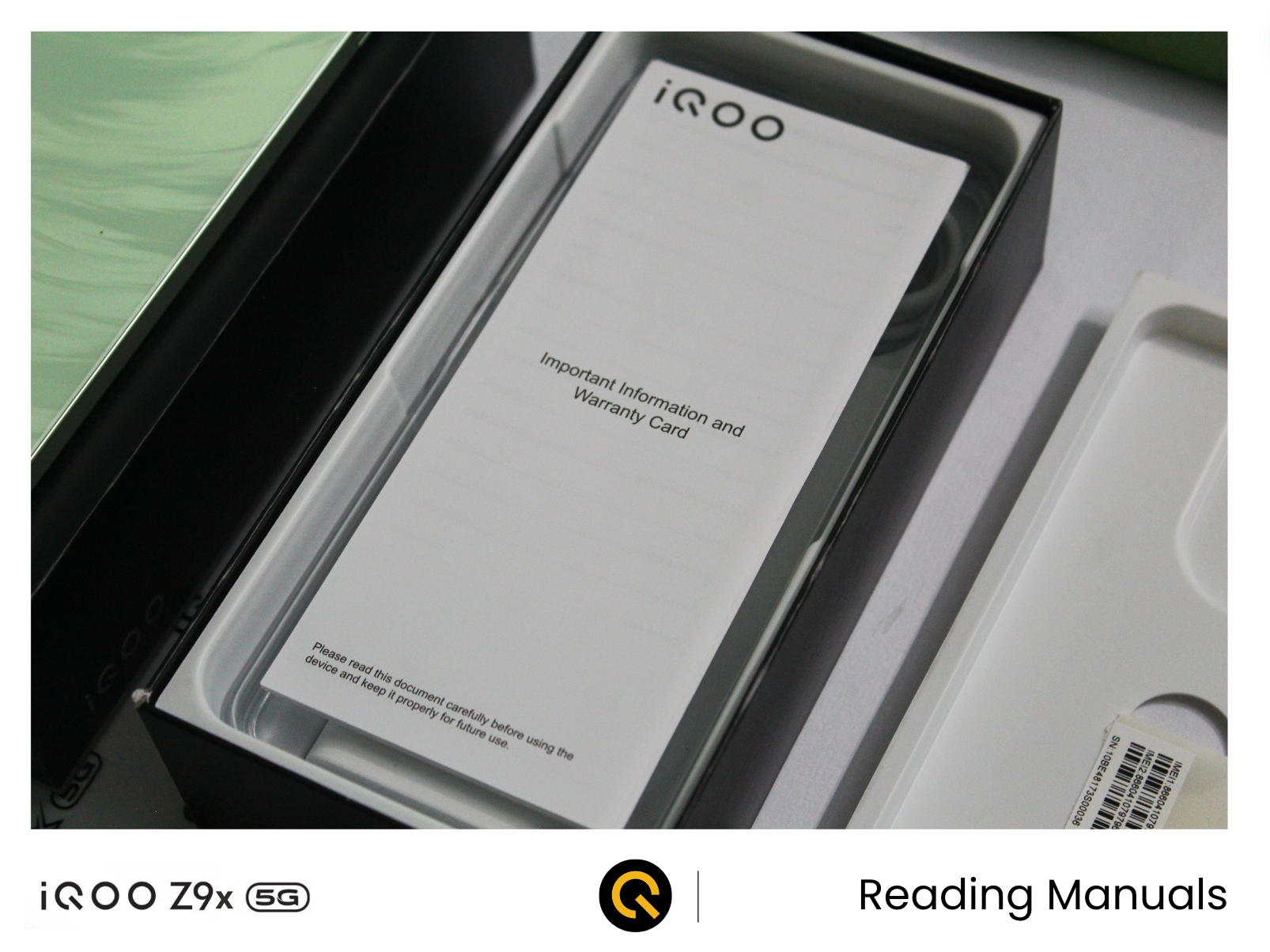 When we remove the top lid after we cut the seal, we will get the iQOO Z9x kept at the top with some IMEI stickers.