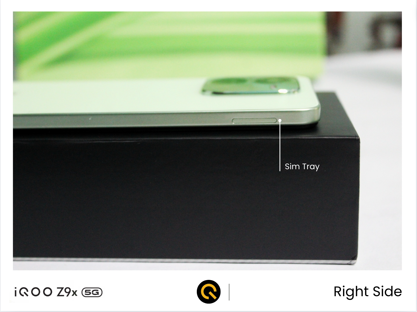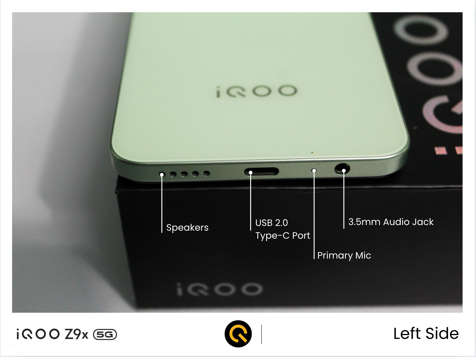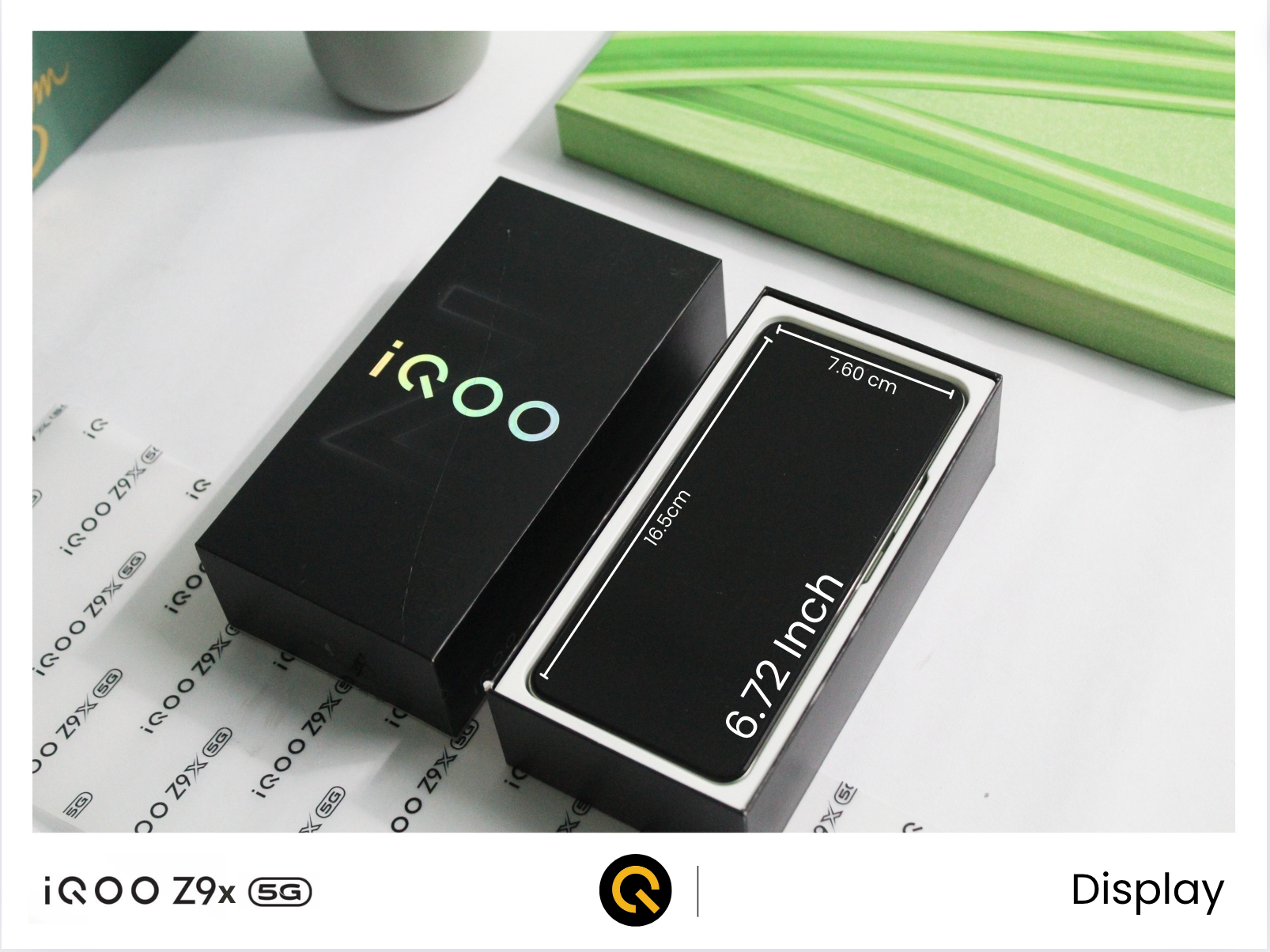 Here is the black retail box of the iQOO Z9x 5G, which is following the new design trend of packaging, i.e., the black box with the silver iQOO logo embossed at the top, and behind that Z logo is hidden.
