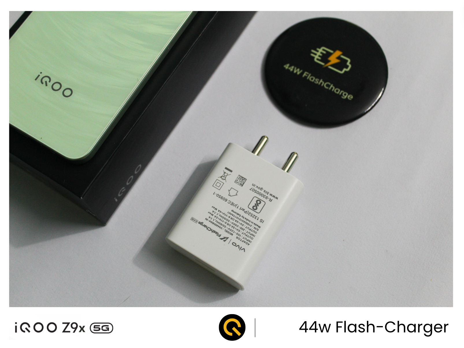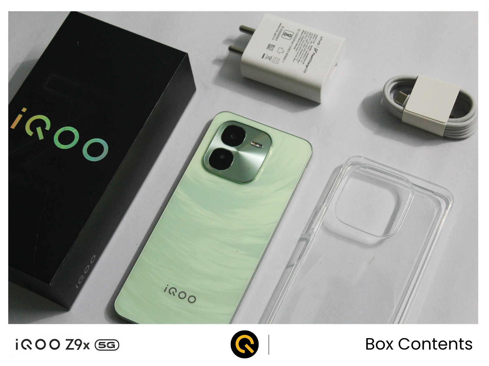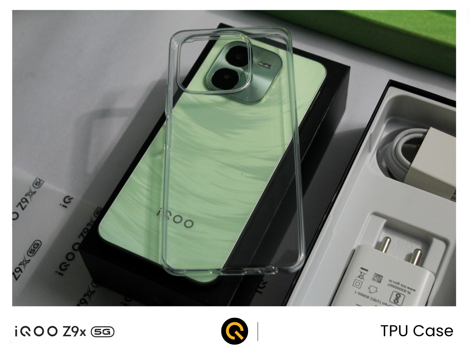 Below the TPU case, we also get a 44-watt flash charger with the Type-C cable in the box to fast charge the iQOO Z9x 5G.
