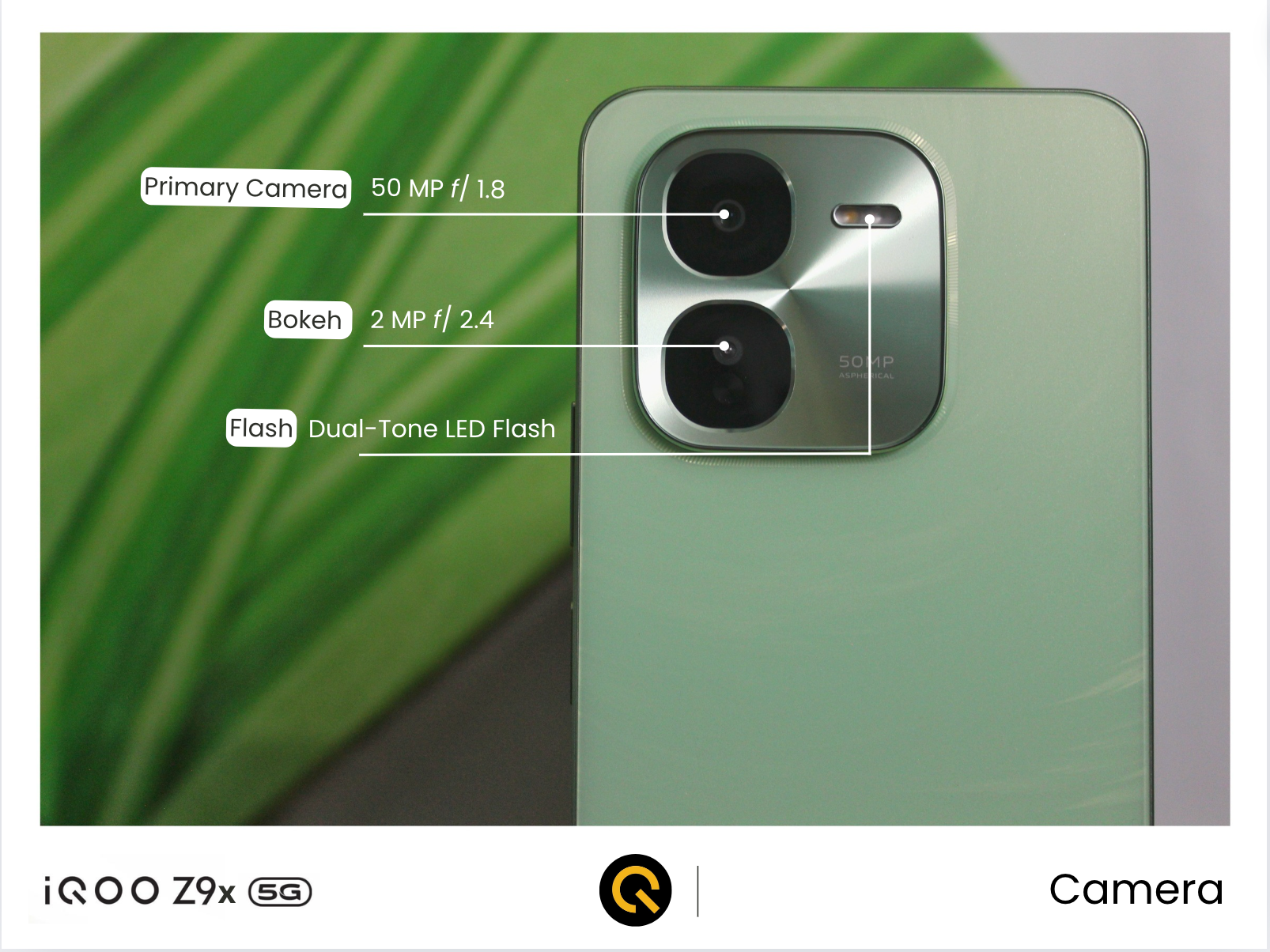 The back of the device has a dual camera setup of a 50MP f/1.8 aperture primary camera and a 2MP f/2.4 aperture Bokeh lens, along with a dual-tone LED flash.