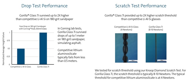 In Corning's laboratory tests, Gorilla Glass 7i demonstrated the ability to withstand drops from heights of up to one meter onto surfaces like asphalt, outperforming other similar glasses which often fail from lower heights. Additionally, Gorilla Glass 7i boasts double the scratch resistance of its competitors.