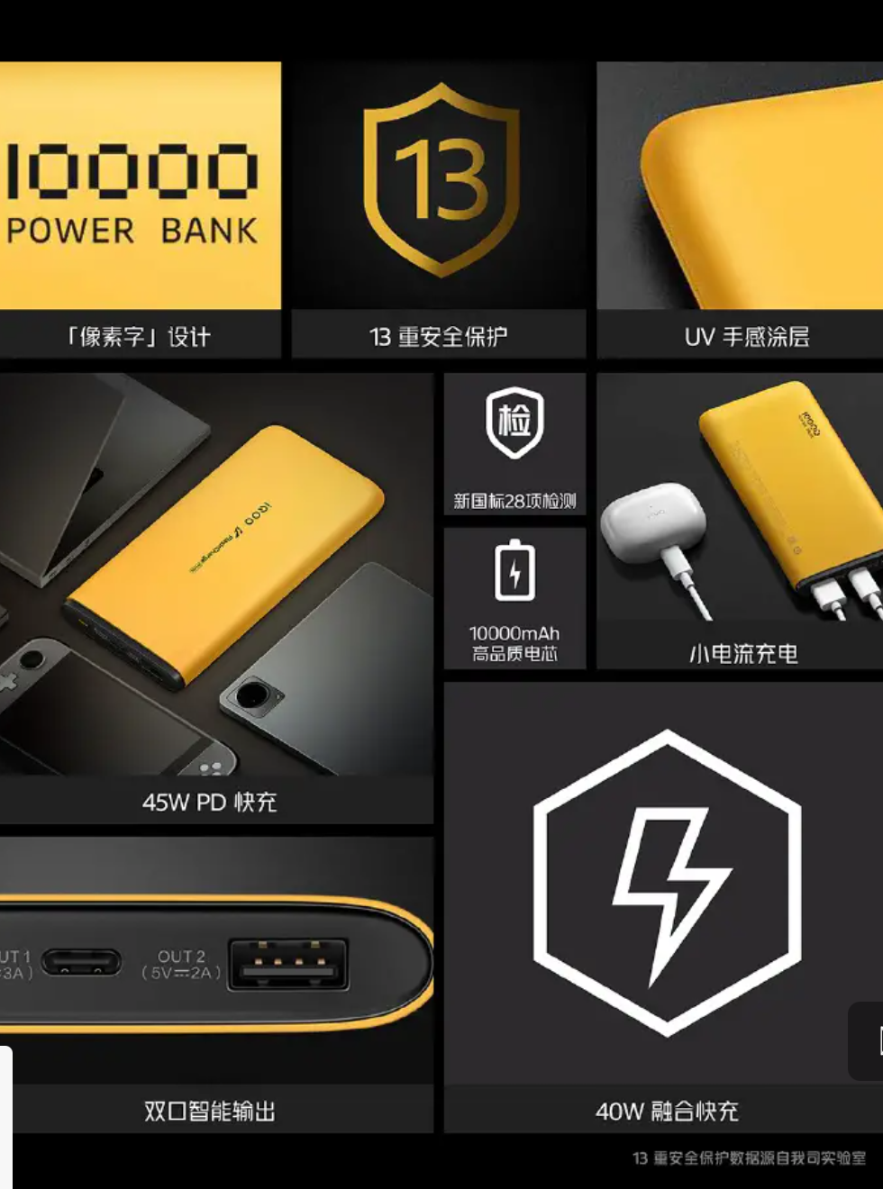 In addition, this 44W flash charging power bank also supports 45W PD fast charging, compatible with some thin and light notebooks and tablets, and supports 40W Fusion fast charging, compatible with more devices in the future. Finally, it supports QC fast charging, which is compatible with typical Android smartphones.