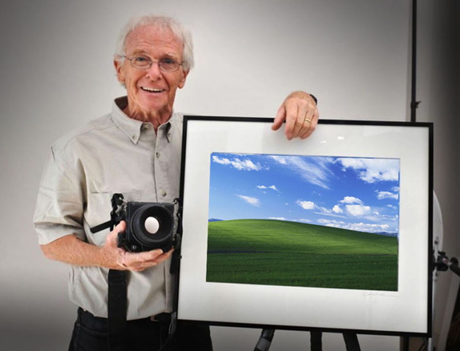 Charles O'Rear, the photographer who capturd the iconic landscape known as "Bliss", used as wallpaper in Windows XP. Microsoft bought this incredible image for 1 million dollars. O'Rear took the photograph in the vineyards of Napa Valley, in the area of San Francisco, California, USA, and did so without digital editing in 1996. This iconic wallpaper, which conveys serenty and optimism, is has become one of the most viewed images. in the history of computing and has inspired countless parodies and tributes in popular culture.
