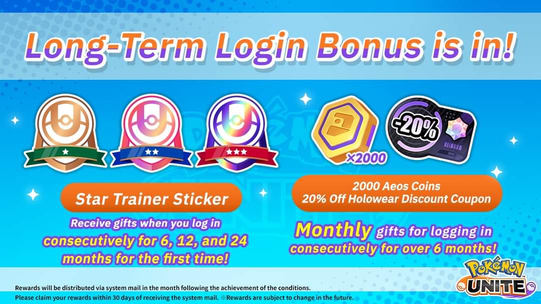 Trainers who log in consecutively for over 6 months will receive Aeos Coins and coupons! Plus, special Star Trainer Sticker for those who log in for 6, 12, and 24 months straight!
