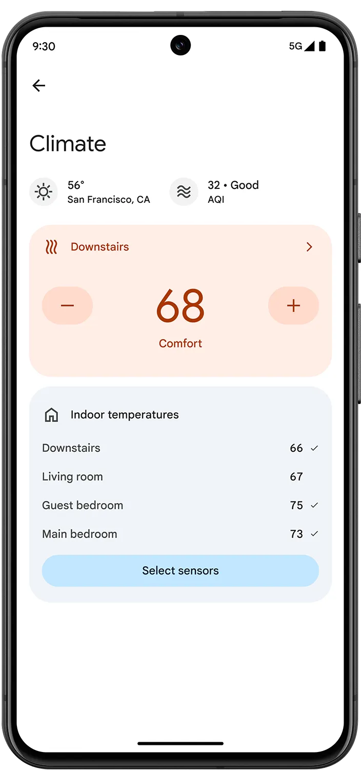 The Google Home app is the one place to control all your smart home devices, including your Nest Learning Thermostat. Many of the most popular thermostat controls in the app, like adjusting the temperature or seeing all of your climate devices, have been redesigned. If you're not at home, you can change the temperature directly from your Pixel Watch. Or if you don't want to get up from the couch, you can control the thermostat via the Home Panel on the new Google TV Steamer when it becomes available on September 24.