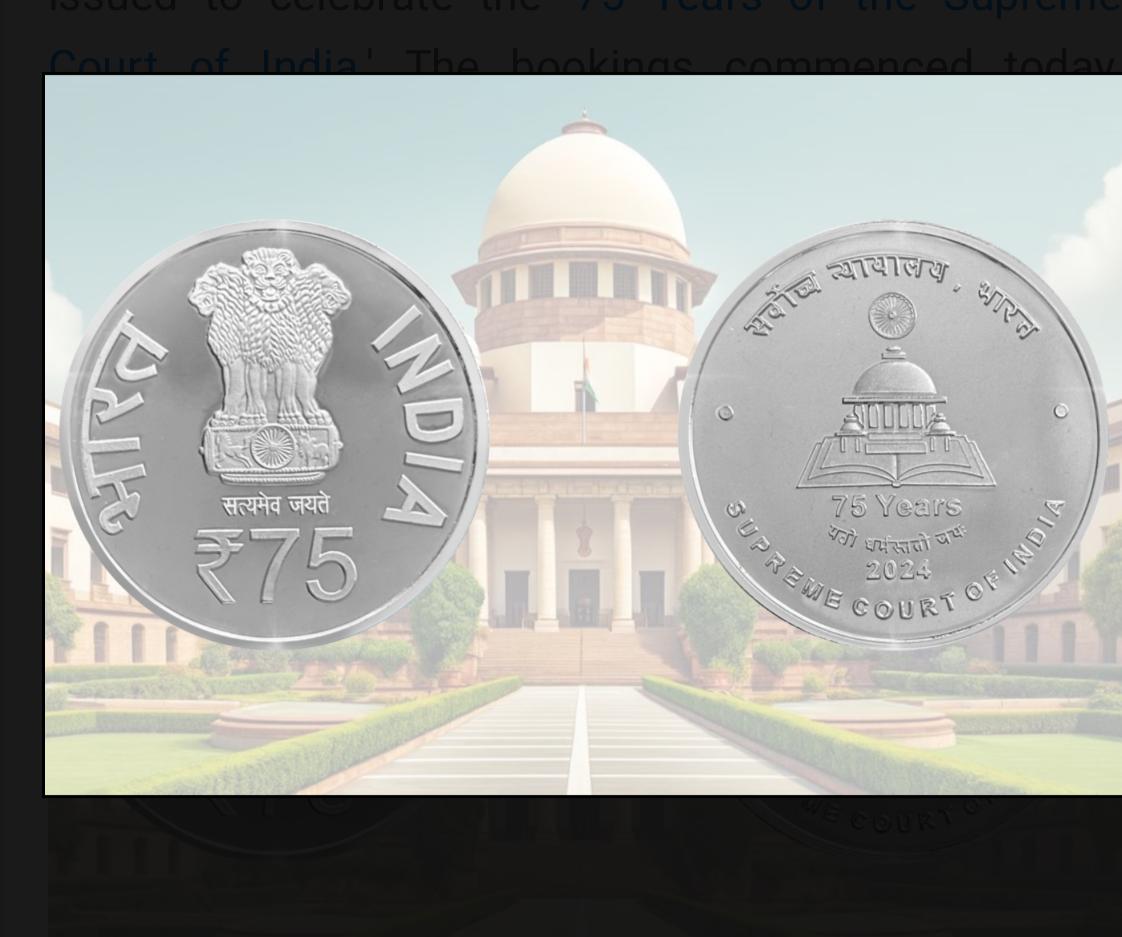 The India Government Mint, Kolkata, has started accepting bookings for the commemorative coin issued to celebrate the '75 Years of the Supreme Court of India.' The bookings commenced today, August 31, 2024, and are subject to limited availability.