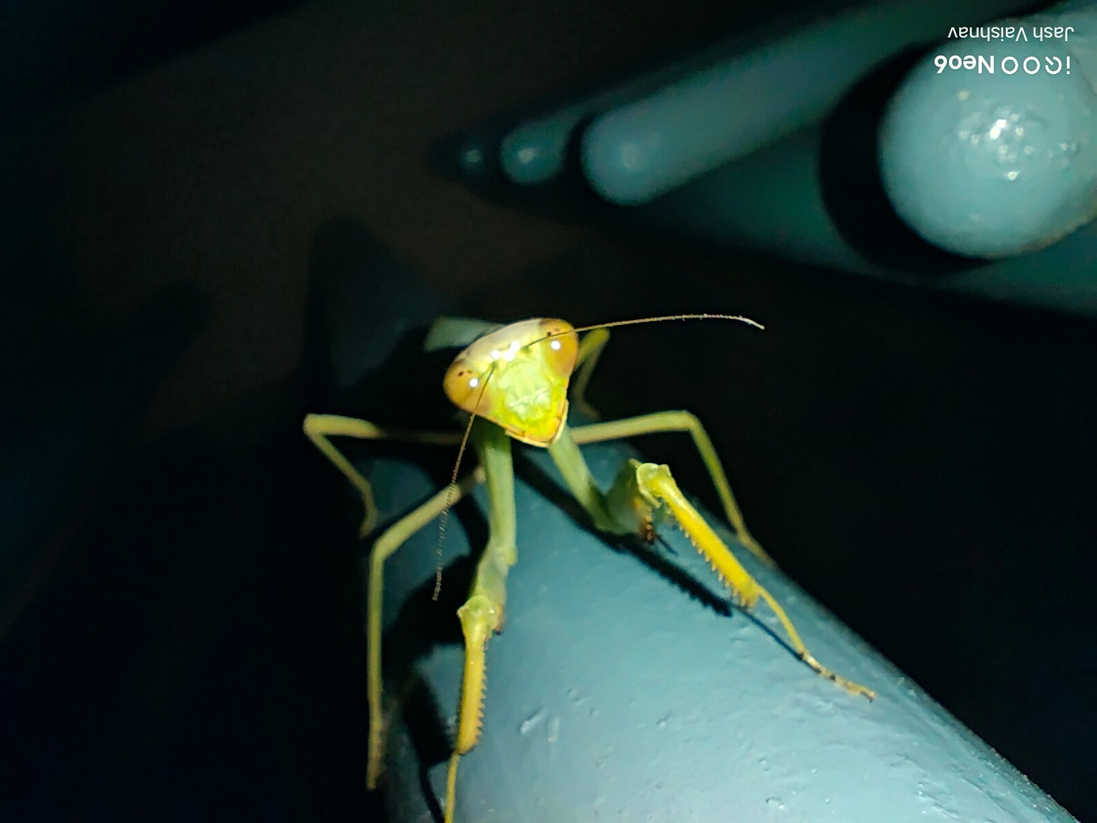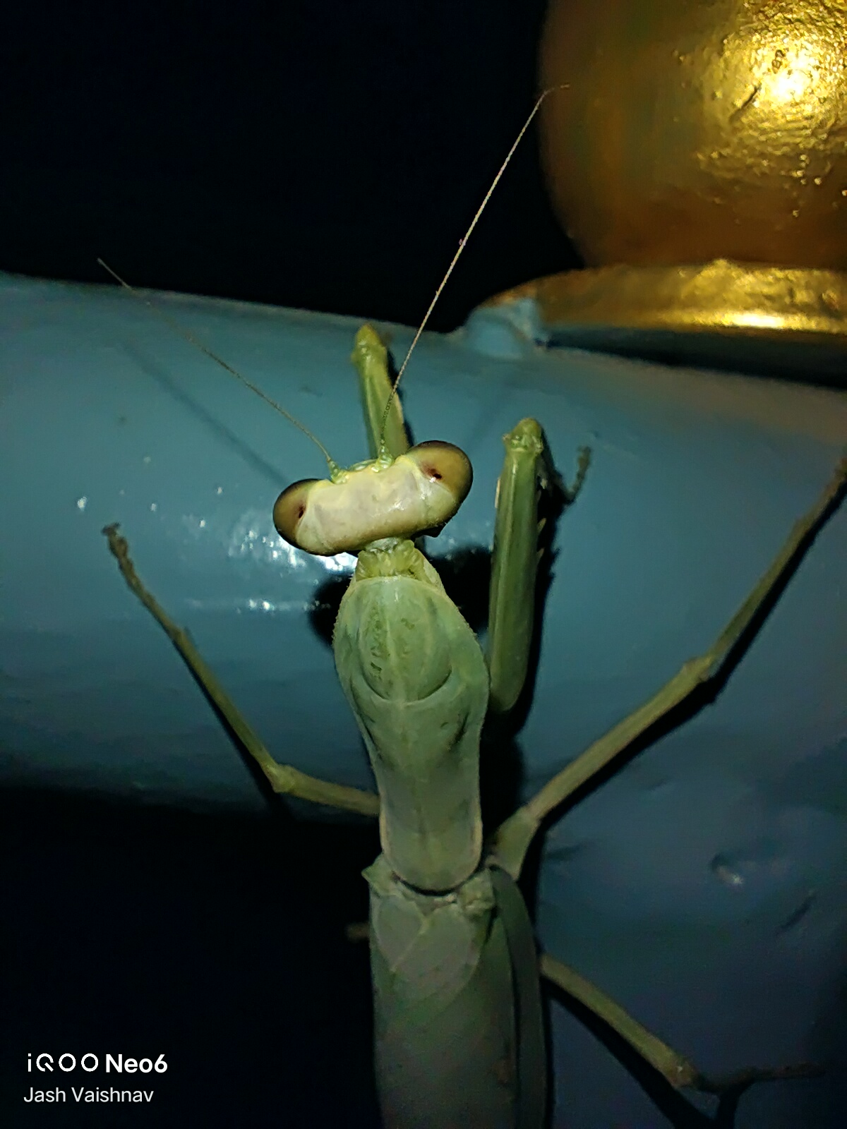 A praying mantis has 5 eyes! You would think two would be enough, but not for a hunter like this. Small eyes in the middle of the head are used for detecting light while the big compound eyes are for seeing movement and having depth vision.