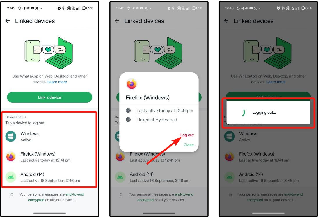 Logging out of a WhatsApp session on Android can be done from the same Linked devices screen.
