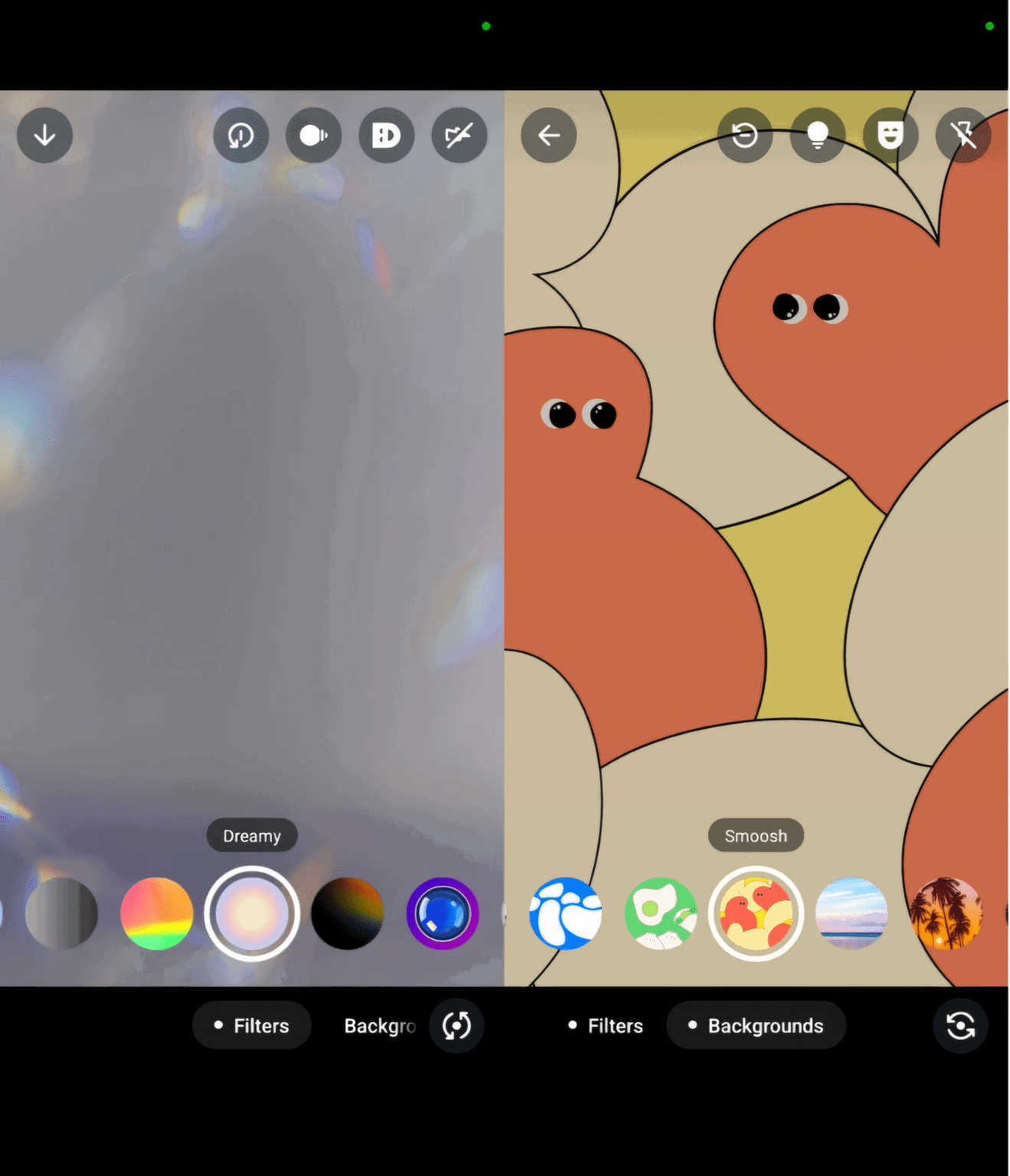 For images, users can choose from a range of filters like Warm, Cool, B&W, Light Leak, Dreamy, Prism light, Fisheye, Vintage TV, Frosted glass and duo tone. As for video calls, available backgrounds include Blur, Living room, Office, Cafe, Pebbles, Foodie, Smoosh, Beach, Sunset, Celebration and Forest.