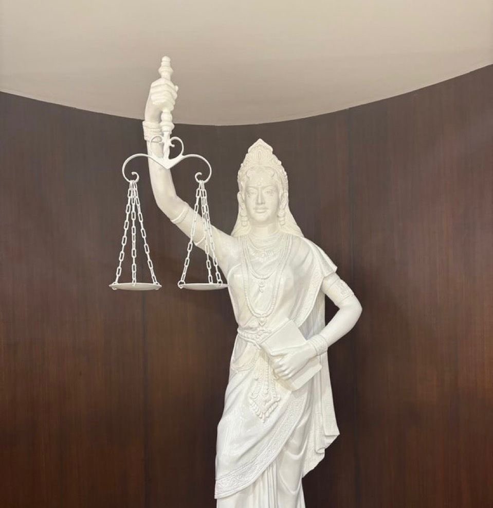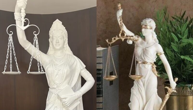 Now she will not be blindfolded. In one hand there will be scales like before but in the other hand there will be a Constitution instead of a sword. There will be a crown on the head. Western Clothes will be replaced by Indian Clothes. 🥻