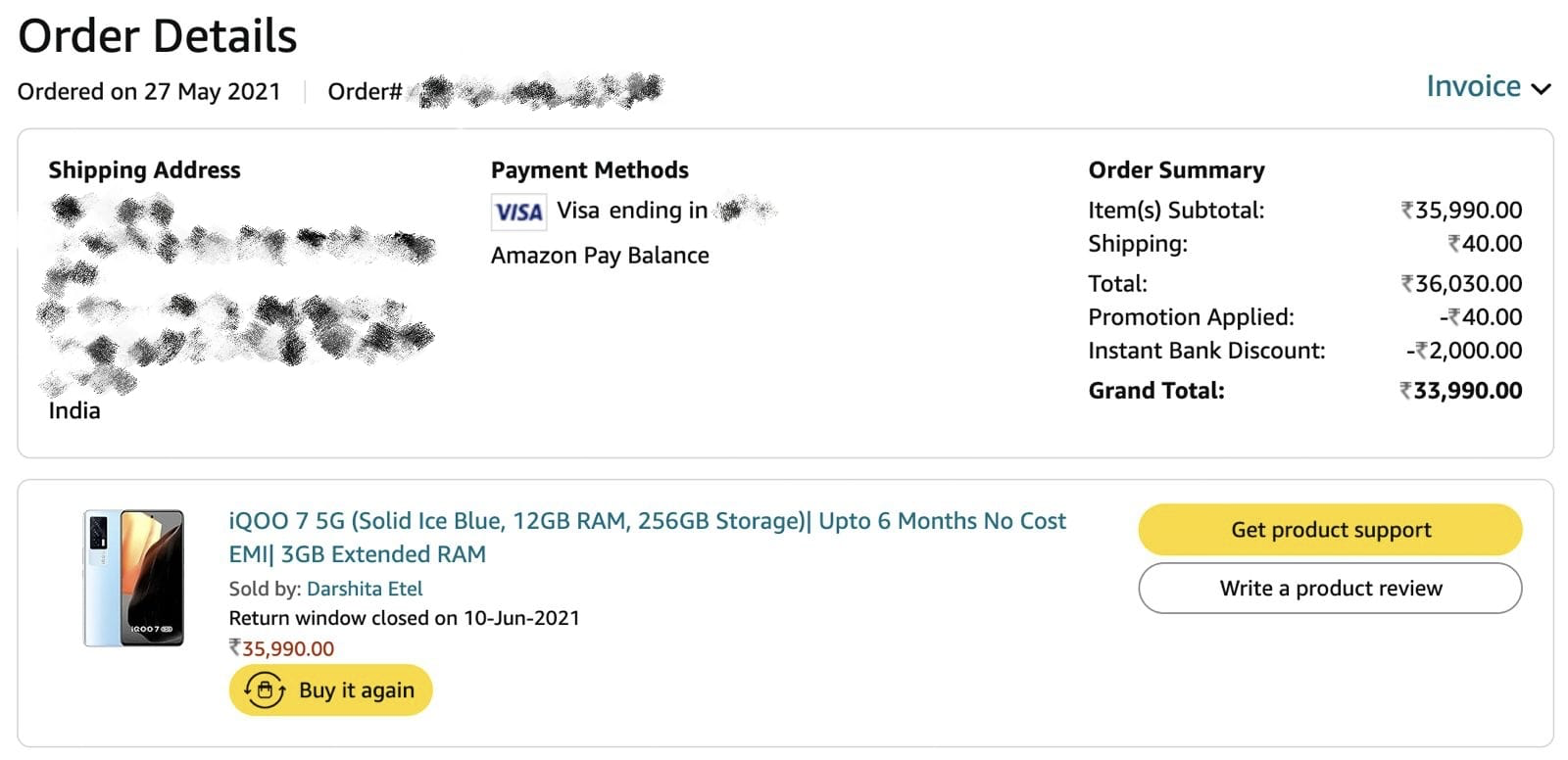 I purchased this monster on 27 May 2021 from Amazon for ₹33,990. I was actually thinking of purchasing the device or not and missed a ₹2000 coupon on this. And after receiving the package and using it, realised that I made the best decision! And its been 3 years 4 months and never been disappointed with the phone! And this was my first step into the iQOO journey.