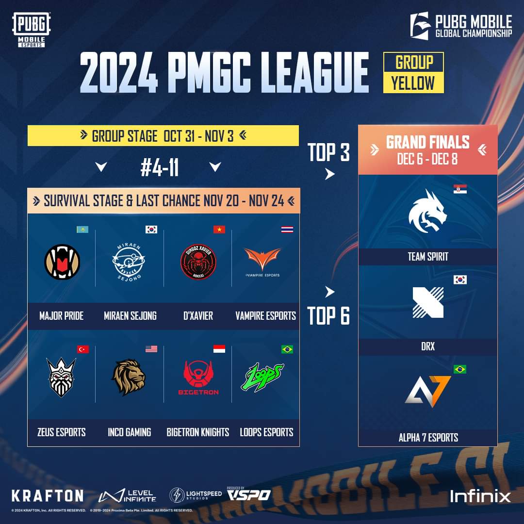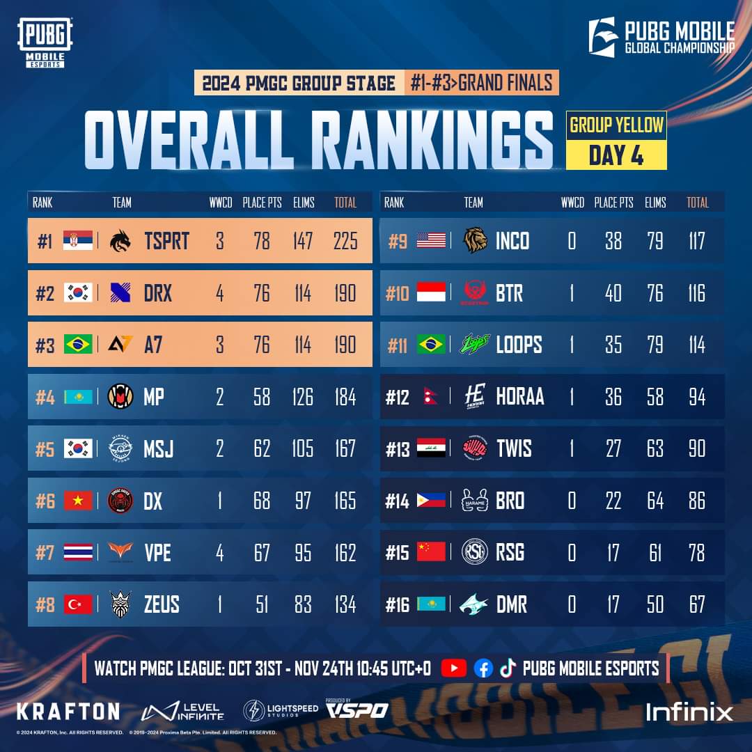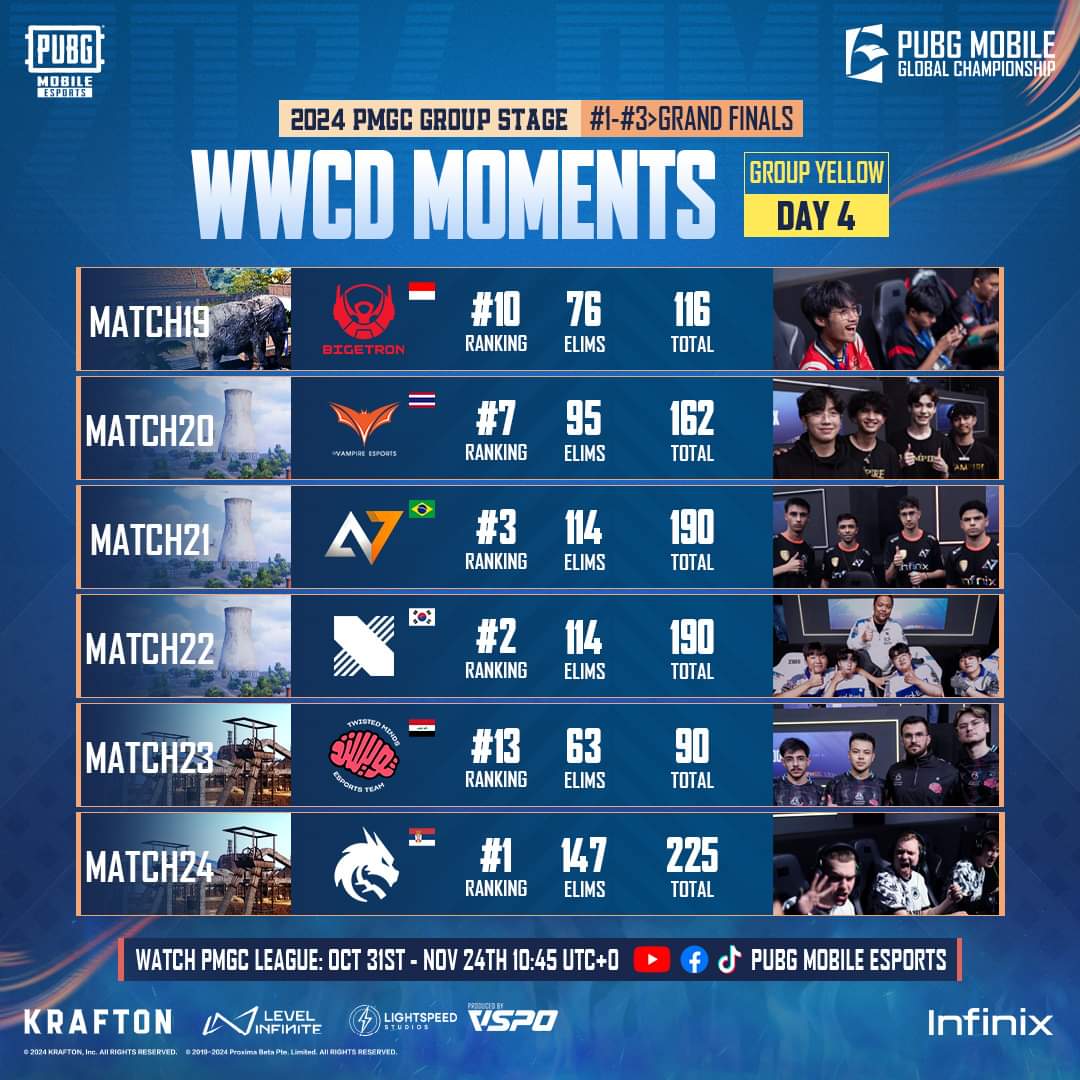 Day 4 of Group Yellow of the PUBG Mobile Global Championship (PMGC) 2024 came to a close on November 3. This event witnessed 16 teams from the group competing in 24 matches across four days. The top three teams according to the overall rankings booked a spot straight in the Grand Finals, while eight teams moved to the Survival Stage. Unfortunately, the bottom five teams were eliminated from the championship.