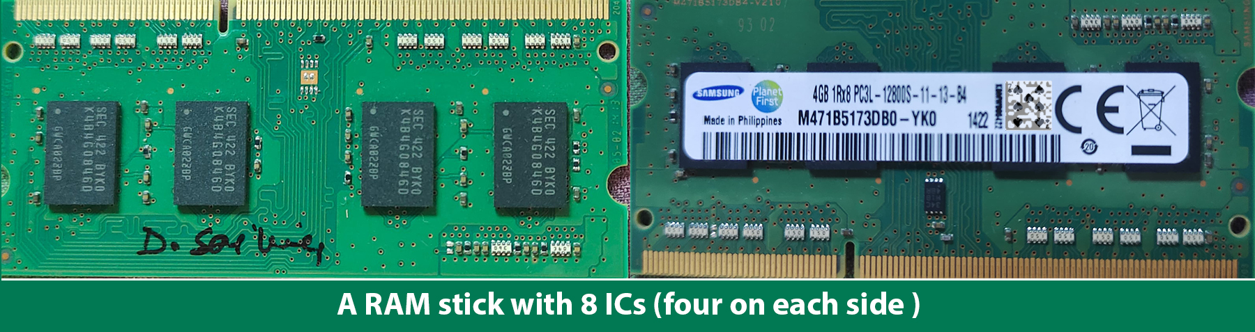 So, expressing RAM speed in MHz will not speak of its true data transfer rates. Instead, most manufacturers tend to express RAM speed in MT/s (Mega transfers/second) which accurately represents its data rate and is usually two times the frequency. So, a RAM component rated at 5600 MT/s operates at 2800 MHz frequency (as each memory module can transfer 2800 x 2 x 106 bytes = 5600 Megabytes of data per second). If we look at a RAM stick of our computer, we usually see 8 memory modules/ICs (see reference picture below), so if we talk about the data bandwidth (maximum data transfer capability) of the RAM it will be = 8 x 5600 MB/s = 44,800 MB/s or 43.75 Gigabytes/second.