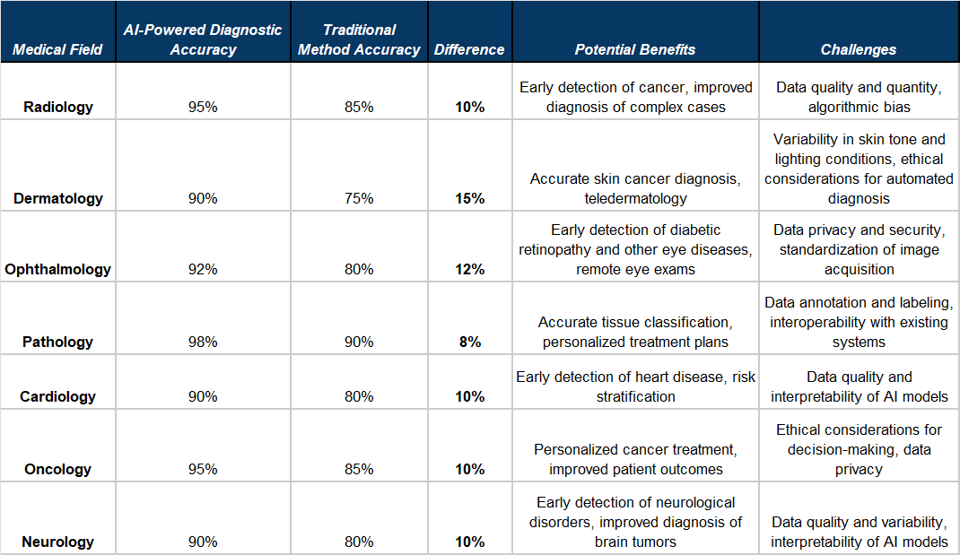 - Early Disease Detection: AI algorithms can accurately detect diseases like cancer, heart disease, and neurological disorders from medical images such as X-rays, MRIs, and CT scans.