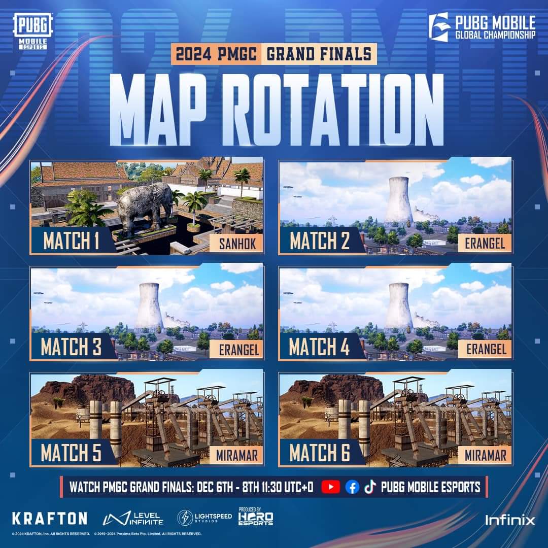 Six matches are scheduled to be organized on each day of the PMGC 2024 Grand Finals. The opening match will be played on Sanhok. The next three games will be contested in Erangel, while the fifth and sixth matches will be hosted in Miramar