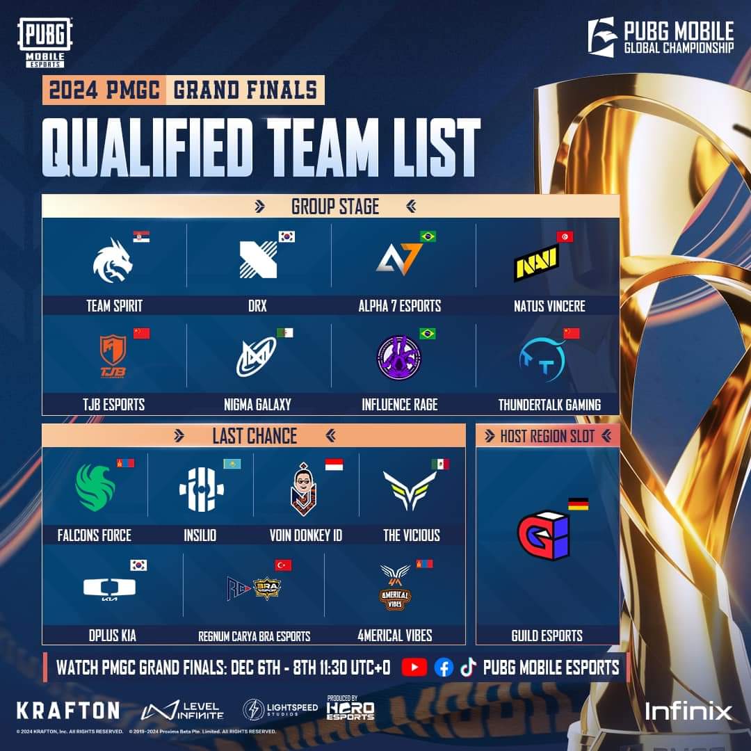 The highly anticipated Grand Finals of the PUBG Mobile Global Championship (PMGC) 2024 is all set to be played from December 6-8 in London, United Kingdom. A total of 16 teams will collide against each other in this three-day contest. 15 of them have been selected from the League Stage, held from October 31 to November 24. Guild Esports from the host region has directly been handed a spot in the Finals.