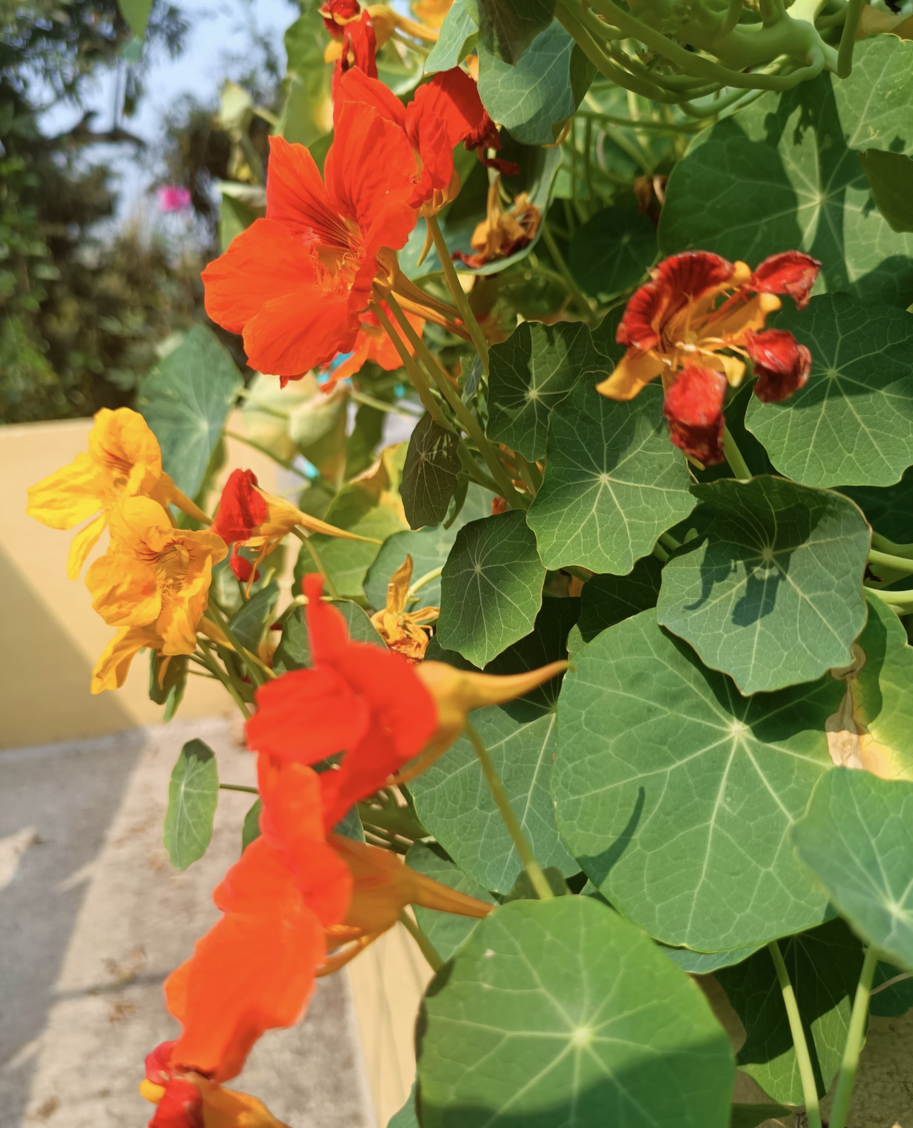 Tropaeolum majus, the garden nasturtium, nasturtium,Indian cress or monk's cress, is a species of flowering plant in the family Tropaeolaceae, originating in the Andes from Bolivia north to Colombia. An easily-grown annual or short-lived perennial with disc-shaped leaves and brilliant yellow, orange or red flowers, it is of cultivated, probably hybrid origin.It is not closely related to the genus Nasturtium.