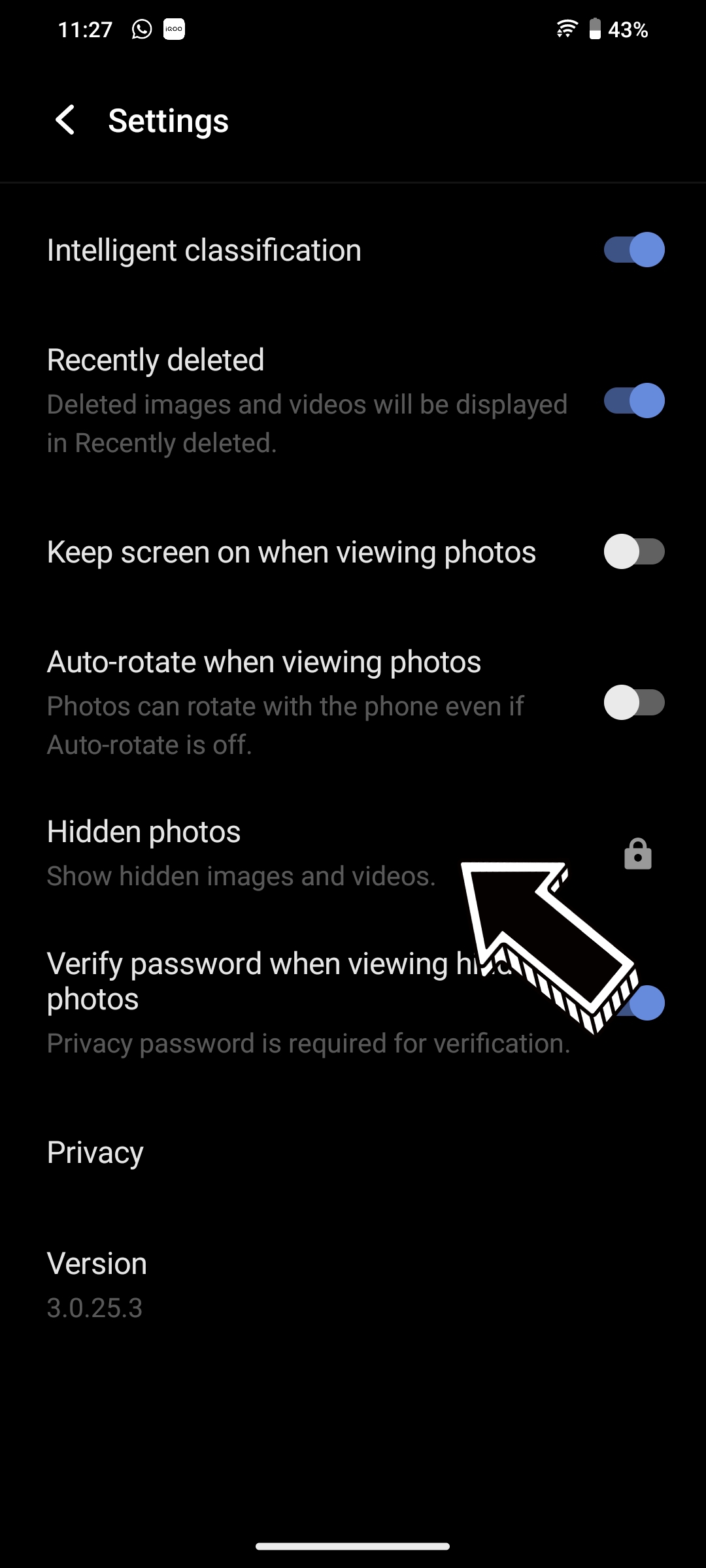 To view the photos go to settings in gallery and select "Hidden Photos"