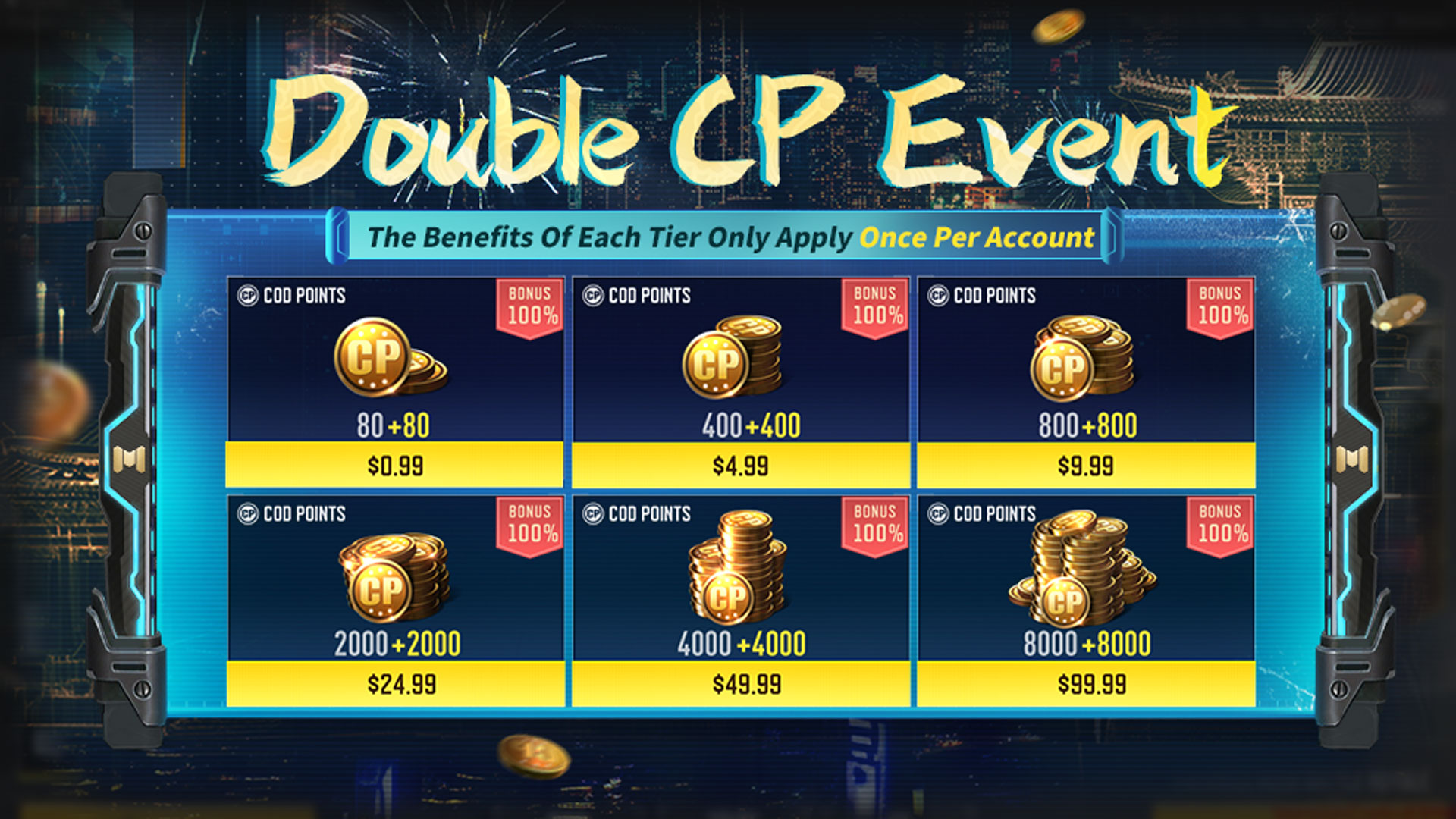 From January 16 through February 19, get double the COD Points when you purchase CP from specified tiers Look for the Double CP event icon on the main screen to see which COD Points purchases are doubled, and with a limit of one purchase per COD Point tier.