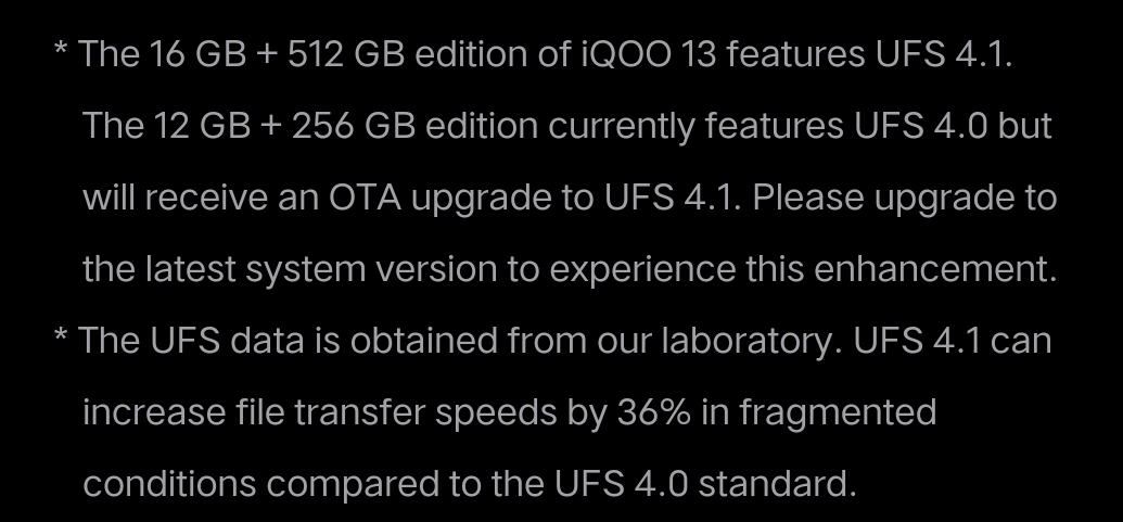 iQOO mentioned on there website that iQOO 13 will receive the OTA upgrade to ufs 4.1 for the 12GB + 256GB. Is it rolled out or we will get this update in future? Becouse the storage speed test I'm getting is like ufs 4.0.