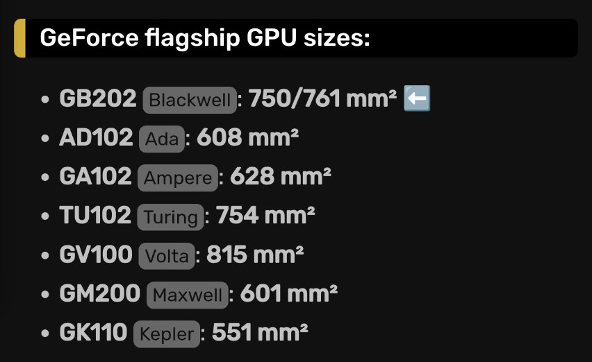 The GB202 die area is 750 mm² according to NVIDIA (via HardwareLuxx) or 761 mm² according to ASUS China General Manager Tony Yu, who revealed the die shots in a longer review of the RTX 5090D graphics card this week. Physically, the GPU die is identical to the GB202-300 used on the RTX 5090, but the 5090D graphics card uses a different variant called GB202-250.