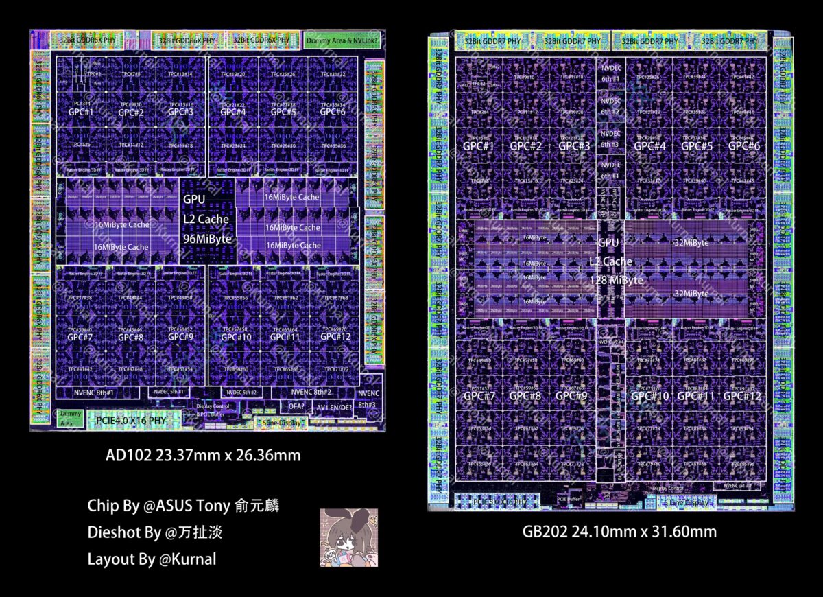 Thanks to Tony's die shot pictures and the work of Kurnal, who provided the adnotations, we can see that the GPU has the same number of GPCS (Graphics Processing Clusters) as the AD102. However, the total SM (Streaming Multiprocessor) count has increased. The GB202 is said to have a total of 96 TPCs (Texture Processing Clusters) and a combined L2 cache of 128GB.