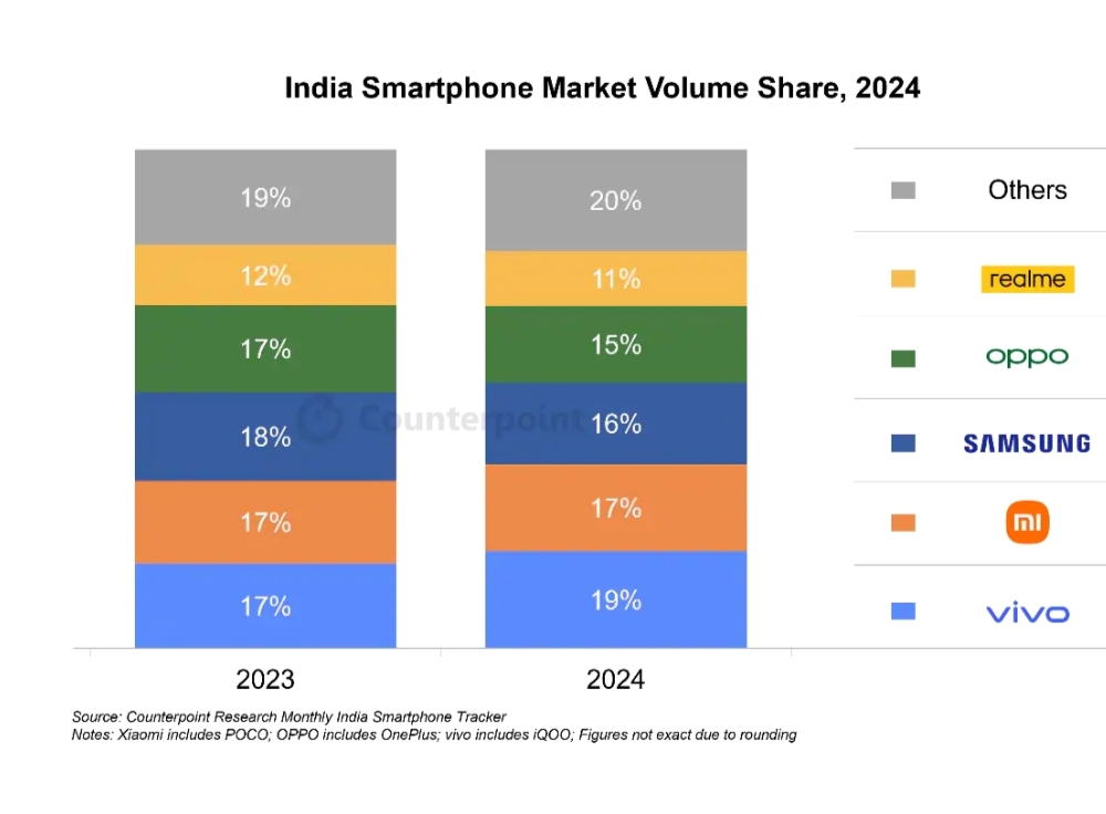 vivo became the top smartphone brand in India by volume for the first time in 2024, registering a 16% YoY growth. Xiaomi secured second place, returning to growth with a 6% YoY increase after struggling in the previous two years. Samsung, which focused on premium devices like the S series, fell to third place due to a weaker presence in lower price segments. Apple continued its upward trajectory, ranking among the top five brands for the first time in Q4 2024, with the iPhone 15 becoming the highest-shipped device of the quarter.