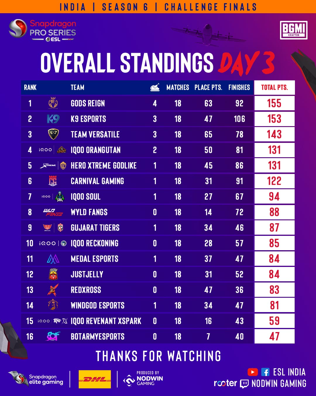 Team Versatile finished third in the event, with 142 points and three Chicken Dinners. The team secured ₹8 lakh in prize money. Their key athlete Spower emerged as the Most Valuable Player (MVP) of the finale with 36 kills.