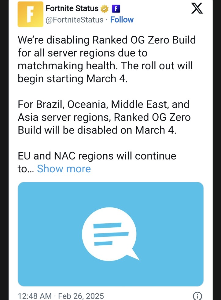 Epic Games has announced that Fortnite's OG Ranked Zero Build servers will soon be shut down, which will start with numerous servers on March 4. Fortnite recently rolled out Chapter 6 Season 2 of its main battle royale mode on February 21, bringing all-new locations and a revamped loot pool to the game.
