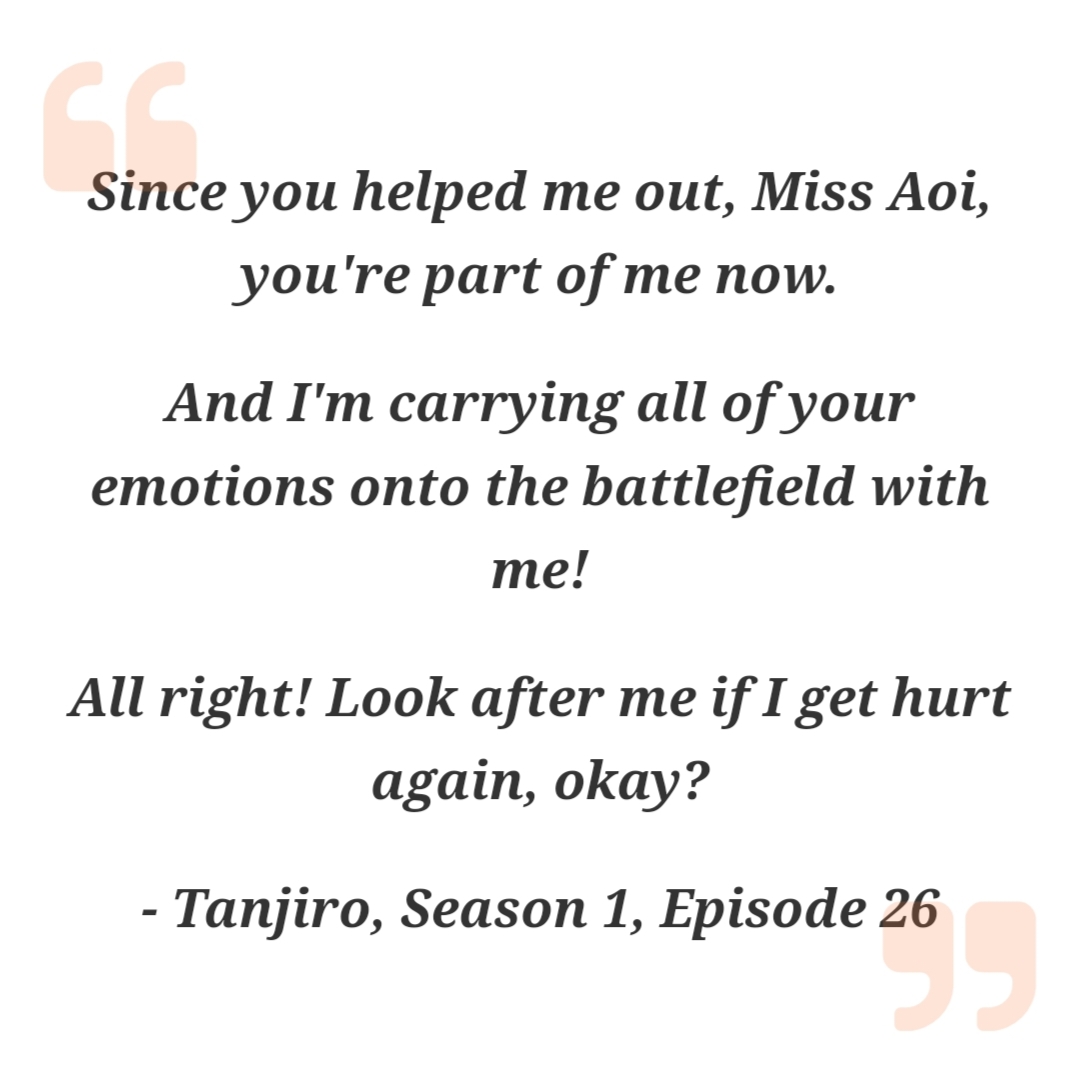 But despite her qualification, Aoi believed that she passed merely due to luck. She also admitted to being too afraid to go into battle and considered herself to be a coward. But, Tanjiro moved Aoi by believing that he would carry her help and emotions into battle with him.