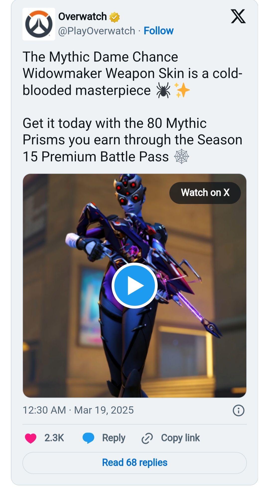 Now that Overwatch 2 has released its mid-Season 15 update , the fifth Mythic weapon skin has officially arrived in the FPS. Dame Chance is a graceful and terrifying sniper rifle ostensibly given to Widowmaker by Maximilien, “Talon’s favorite financier.” The weapon features unique sound effects, a glowing ammunition core, and spider-like UI elements that track kills and evolve as players take down their enemies. Unlocking all of Dame Chance also grants fans access to a unique weapon flourish where Widowmaker spins her Grappling Hook, and an on-kill effect featuring a purple explosan evocative of a spider’s web.
