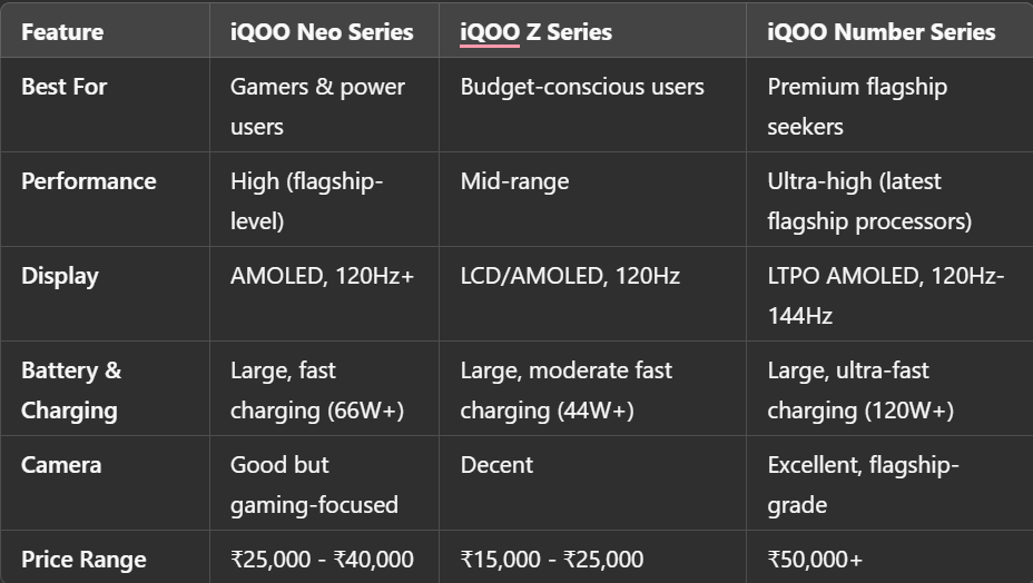 Choosing the right iQOO phone depends on your priorities. If you’re a gamer craving high performance, the iQOO Neo series is perfect for you. If affordability is your key concern, the iQOO Z series offers great value for money. However, if you want the best of the best with top-notch features, the iQOO Number series is your best bet.
