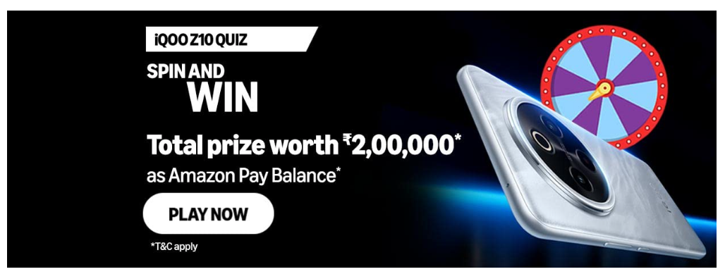 Amazon is running an Exciting 'Spin and Win' Quiz for #iQOOZ10 .Participants have a chance to win* up to ₹50,000 as Amazon Pay balance🤑