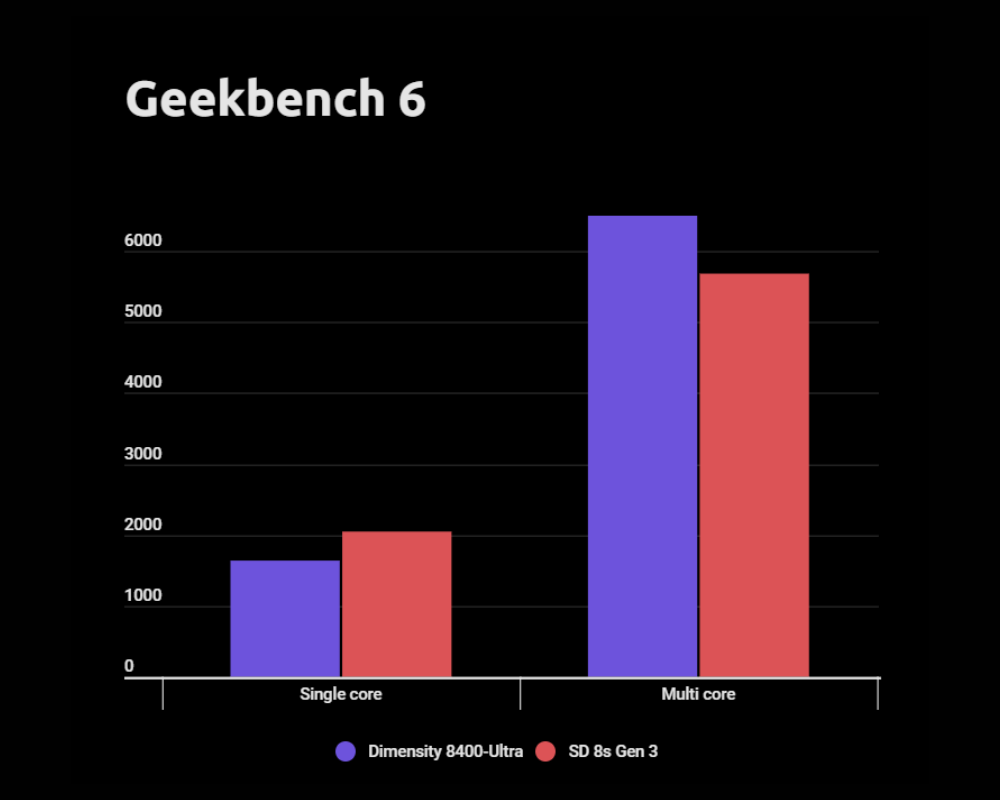 According to Geekbench, both chipsets have similar multi-core performance. However, the Snapdragon 8 Gen 3 outperforms the Dimensity 8400 Ultra in single-core performance by 35%.