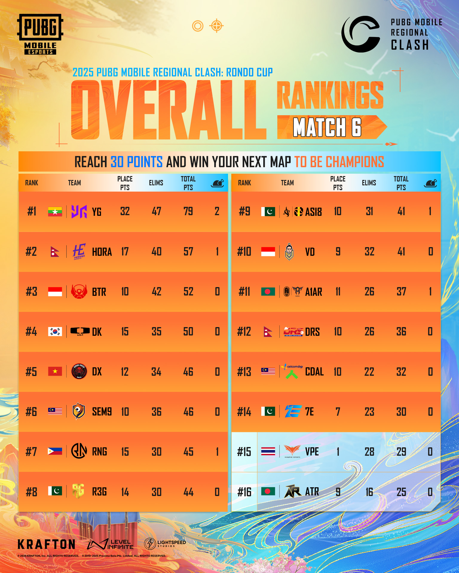 Yangon Galacticos’ mastery of the Rondo map was on full display as they outmaneuvered top-tier teams, accumulating the highest points among all 16 competitors. With no team claiming a ‘Winner Winner Chicken Dinner’ after reaching match point within six rounds, Yangon Galacticos’ immense 79 points sealed their victory during the 2025 PUBG MOBILE Regional Clash, claiming the largest share of the $20,000 prize pool. Horaa Esports and Bigetron Esports showcased incredible resilience and high-level gameplay, battling their way to second and third place respectively.