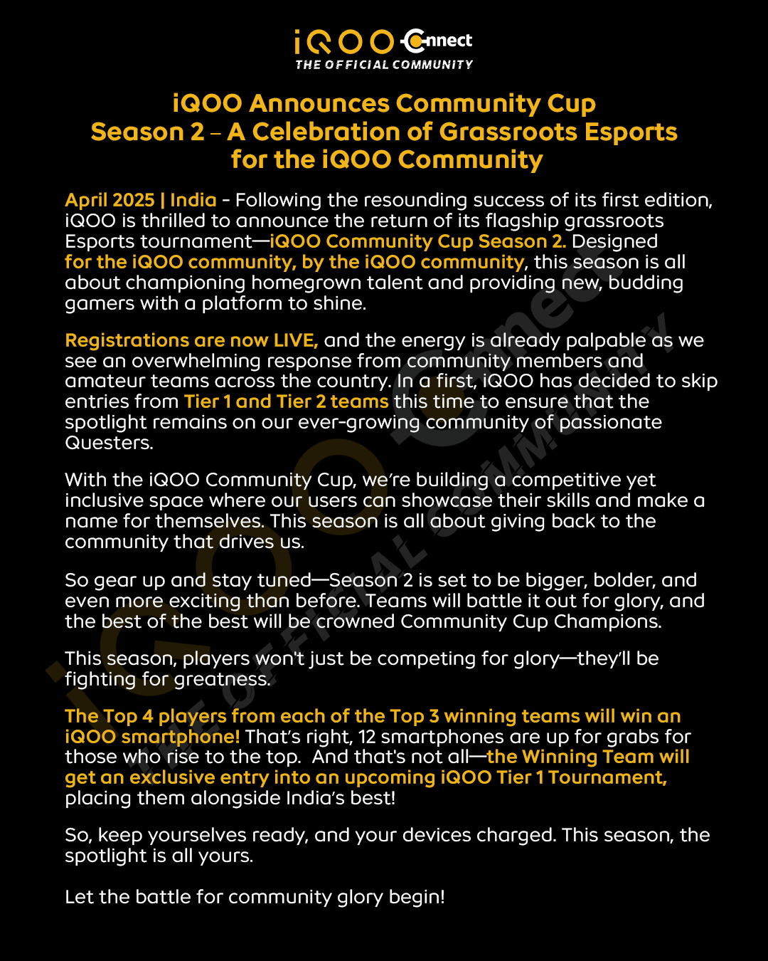 We know how much you love the thrill of gaming, and we're just as excited! That's why we've made a few changes — the dates and schedule for the upcoming iQOO Community Cup Season 2 have been revised to give you the best possible experience. 🗓️🔥