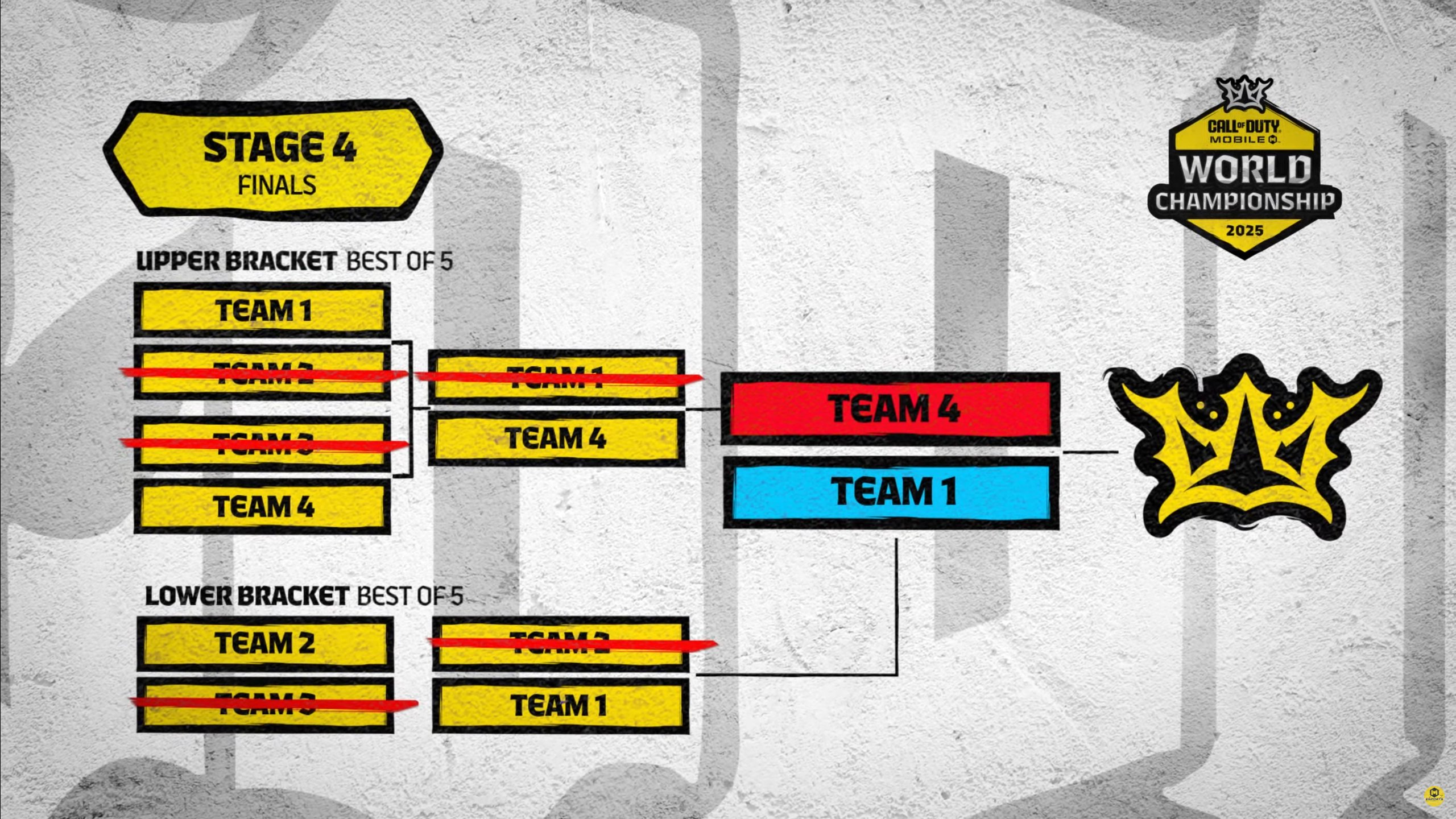The top two from each region will then compete in the stage four finals. In the playoffs stage, the remaining top four will then play a double-elimination bracket to determine the 2025 COD Mobile world champions.