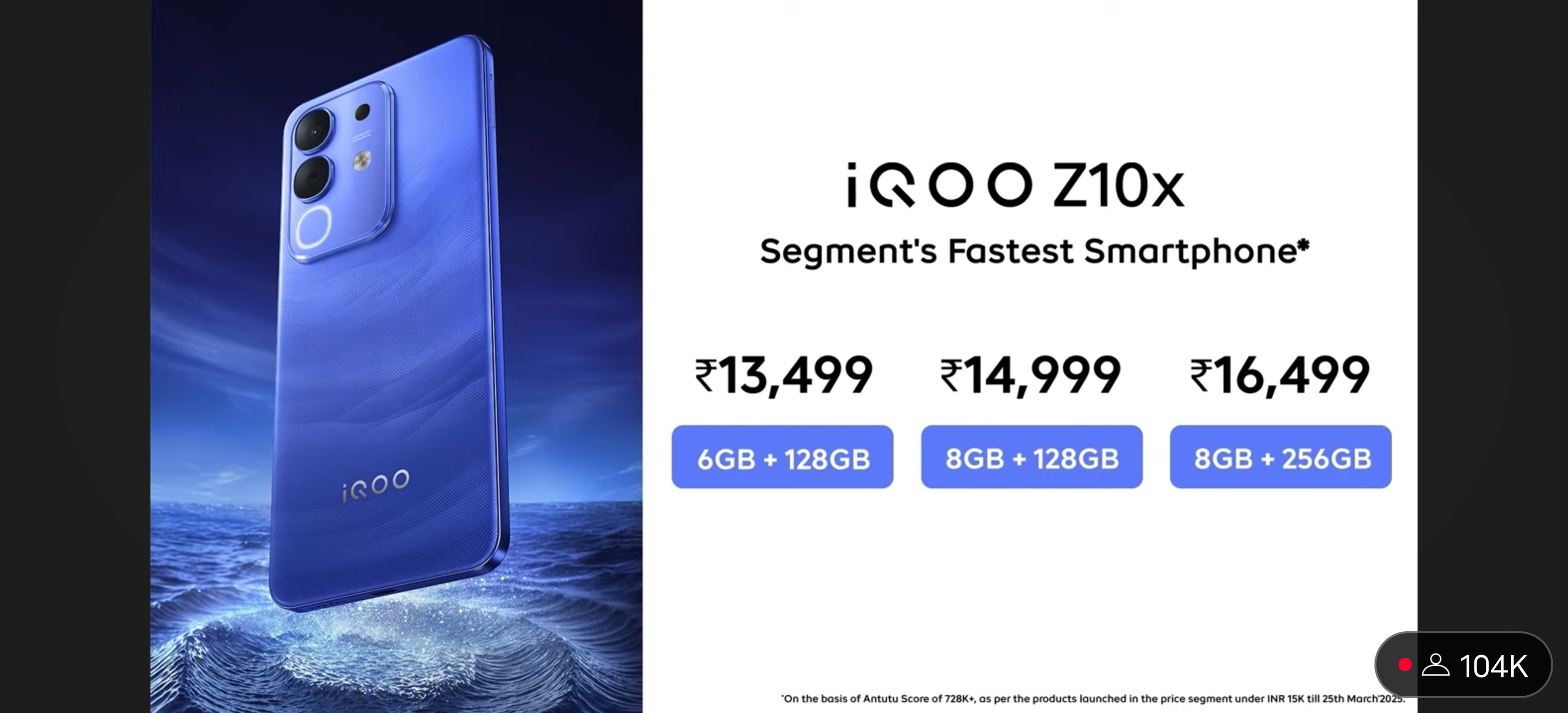iQOO Z10x costs Rs. 13,499 for the 6GB + 128GB version. The 8GB + 128GB and 8GB + 256GB models are priced at Rs. 14,999 and Rs. 16,499, respectively. It is available in Ultramarine and Titanium colourways. Bank-based offers bring down the effective price of the phone to Rs. 12,499.