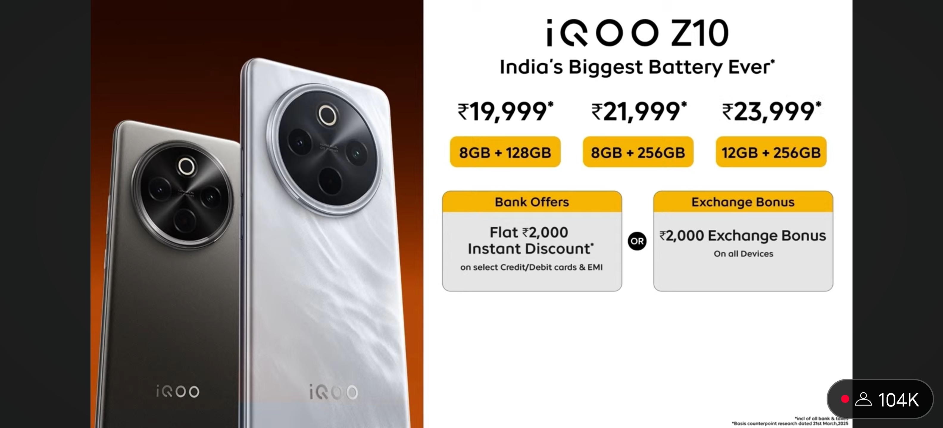 The iQOO Z10 is priced at Rs. 21,999 for the 8GB + 128GB model. The 8GB + 256GB and 12GB + 256GB versions are priced at Rs. 23,999 and Rs. 25,999, respectively. It is available in Glacier Silver and Stellar Black colour options. With instant bank discounts and exchange offers, customers can buy the handset for a starting price of Rs. 19,999.
