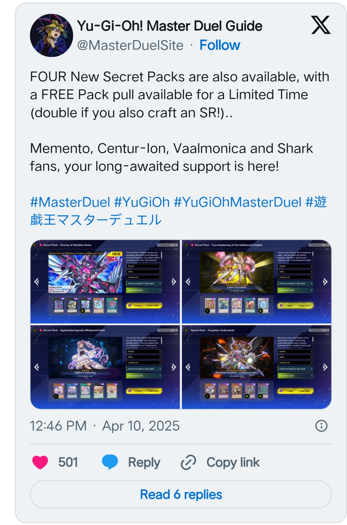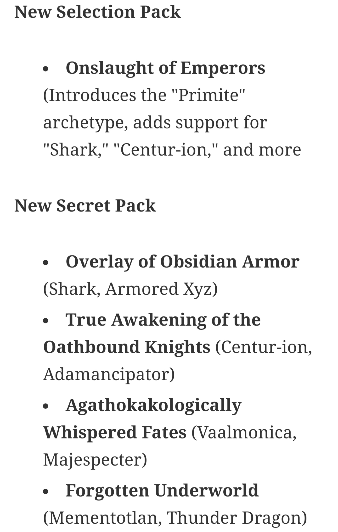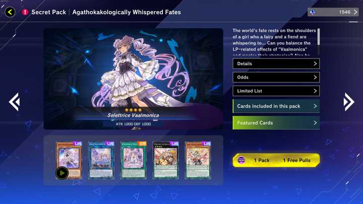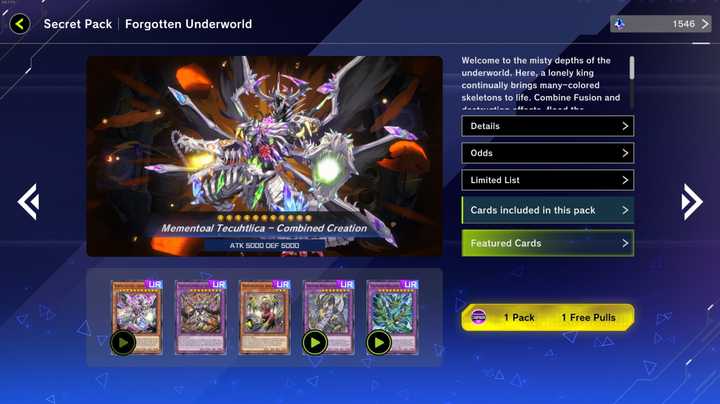 Master Duel's new Secret Packs will allow players to more easily acquire cards for a wide variety of themes. The Shark cards in the Selection Pack have also received their own Secret Pack with "Overlay of Obsidian Armor," while the popular "Centur-Ion" theme received the "True Awakening of the Oathbound Knights" pack. The "Vaalmonica" and "Majespecter" decks serve as the featured archetypes in "Agathokakologically Whispered Fates," while "Forgotten Underworld" focuses on the "Mementotlan" and "Thunder Dragon" decks. Players can also obtain one free pack of each Secret Pack while they are featured in the shop.