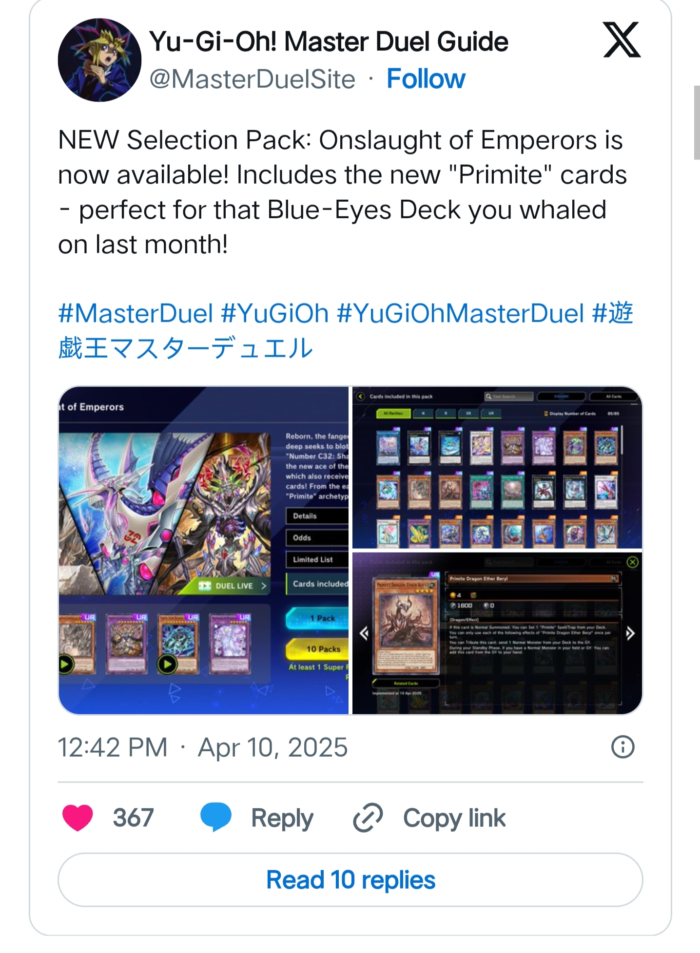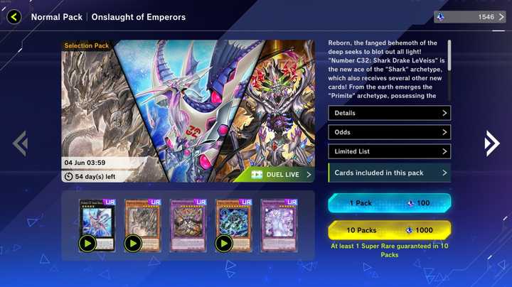 Yu-Gi-Oh Master Duel officially rolled out its newest packs on Thursday, introducing one new Selection Pack and four new Secret Packs to the game. "Onslaught of Emperors" introduces several new themes to the game, including the new "Primite" archetype and updated support for the popular "Shark" deck featured in the Yu-Gi-Oh ZEXAL anime . The Selection Pack also adds several powerful individual cards used by prominent decks, like "Necroquip Princess" as an option for the "Fiendsmith" archetype. "Onslaught of Emperors" will be available through the in-game shop for two months, set to rotate out on June 4.