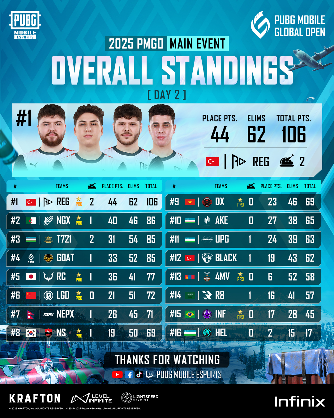 Defending champions REJECT from Japan had an average run in the PMGO, with the organization ranking fifth with 77 points and one Chicken Dinner. LGD from China was sixth with 72 points, while NEPX from Nepal finished seventh with 71 points and one Chicken Dinner