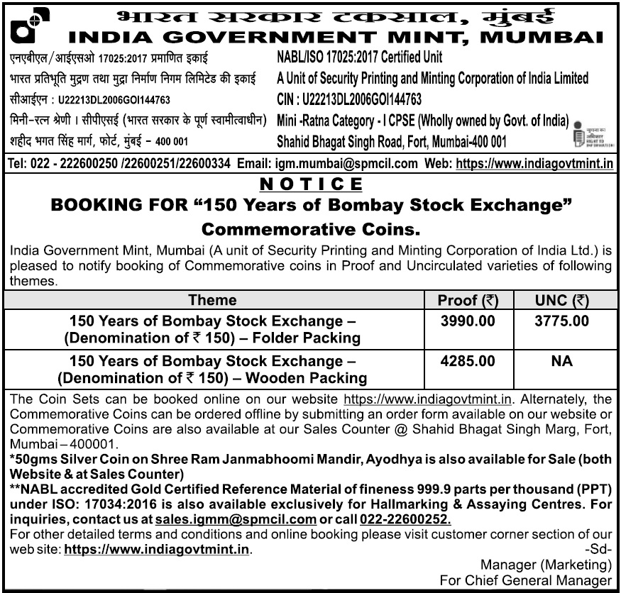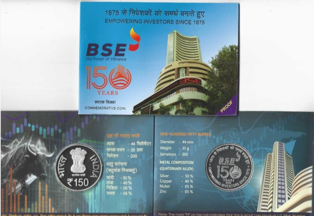 The India Government Mint, Mumbai, has opened bookings for ₹150 commemorative coin issued to celebrate 150 Years of Bombay Stock Exchange (BSE). The bookings begans from this week , and are available in limited quantities.