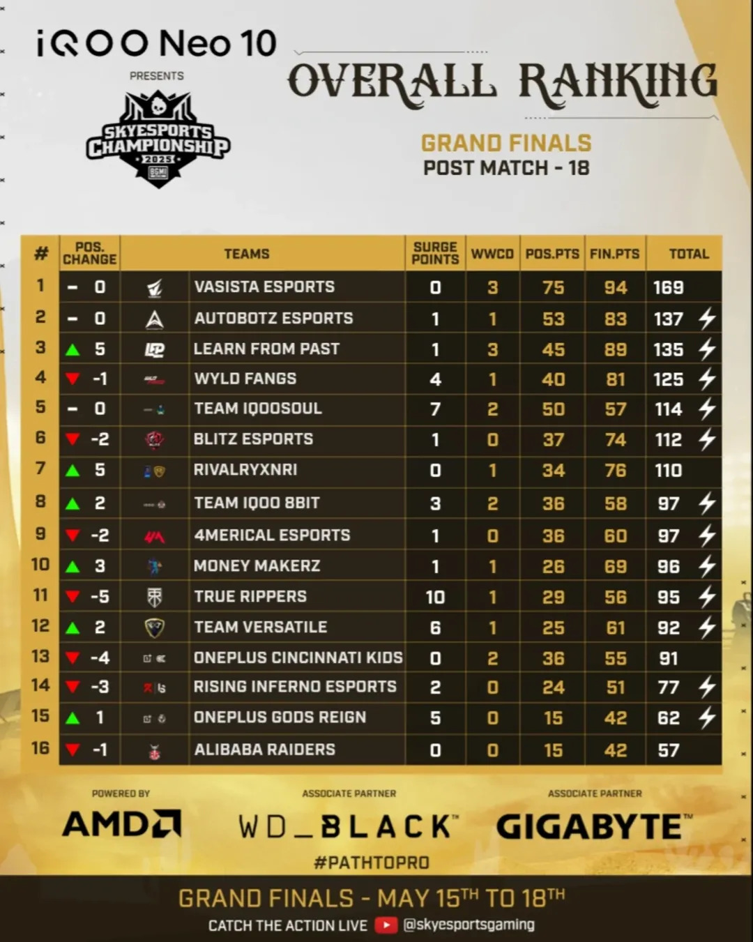 The Grand Finals occurred from May 16 to 18, featuring 16 teams fighting it out in a Smash Rule format. The tournament, hosted by Skyesports, boasted a ₹15 lakh prize pool.
