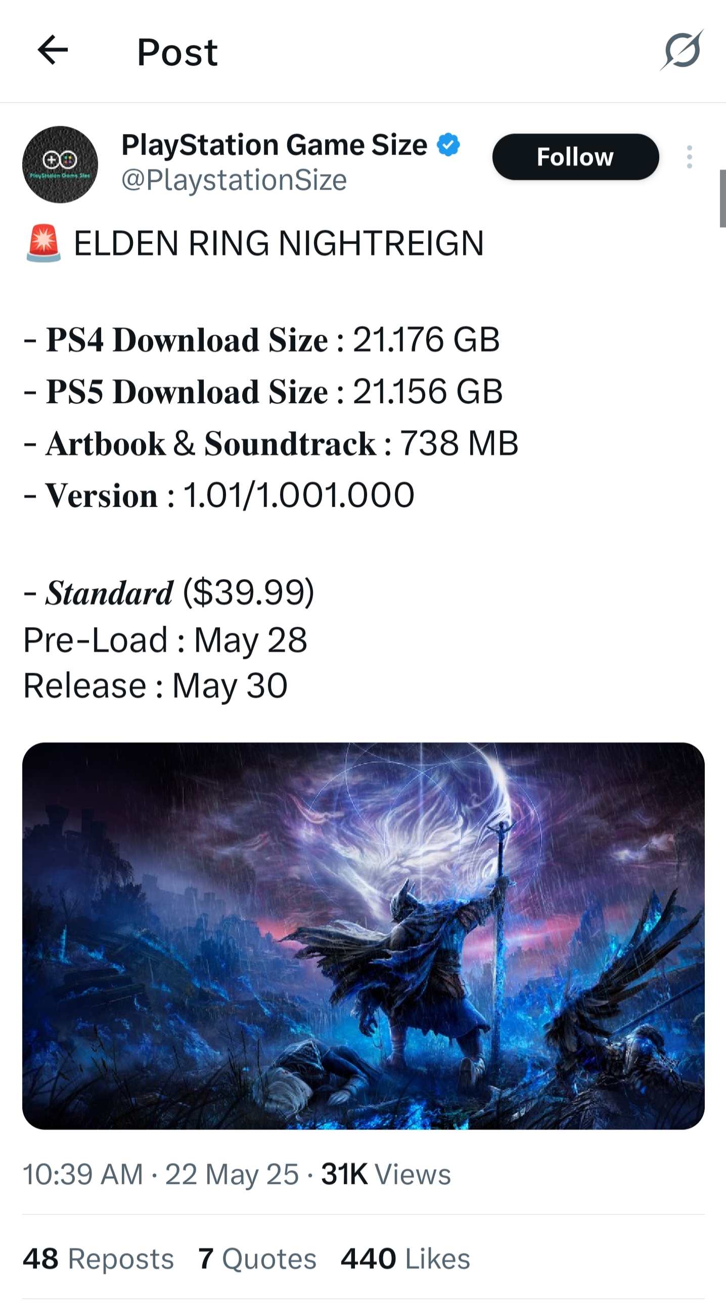 The social media account PlayStation Game Size recently confirmed how big Elden Ring Nightreign will be for PS4 and PS5 users. PlayStation 4 users will need to set aside 21.176 GB, while PS5 players will need slightly less at 21.156 GB. For those downloading the Elden Ring Nightreign digital bonuses, the artbook and soundtrack come in at 738MB. Unfortunately, the file sizes only reflect the PlayStation consoles, though both Xbox and PC should be fairly similar. Regardless, it looks as though Elden Ring Nightreign won't be resource intensive once it does launch.