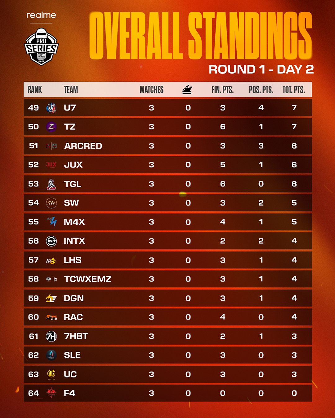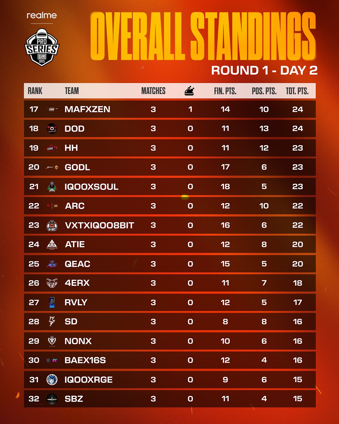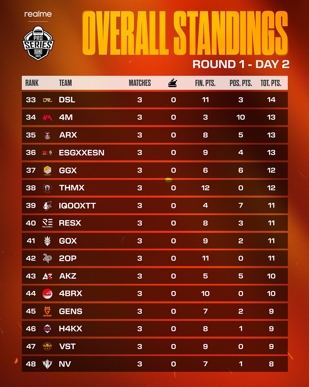 Gods Reign, led by Destro, finished seventh with 33 points and one Chicken Dinner. Autobotz was eighth with 33 points. Volcano Esports and 4TRX have scored 30 points each. Jaguar Esports finished 11th with 29 points.