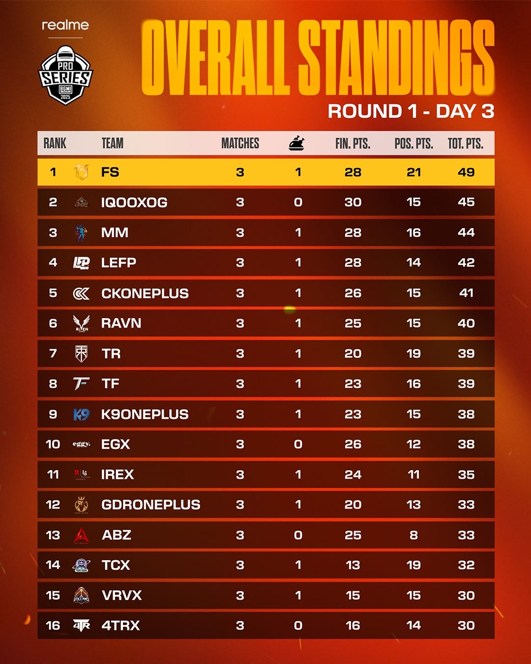 Day 3 of the BMPS 2025 Round 1 wrapped up on May 24. All 96 participating teams played their initial three matches of the round. They will once again be divided into six groups for their next three matches. FS Esports emerged as the top performers with 49 points, grabbing one Chicken Dinner and 28 finishes.