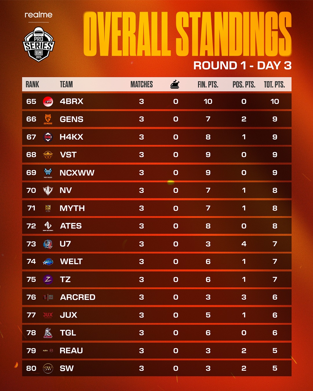 Genesis Esports, led by Shadow, was 66th with nine points. Rising squad VST also scored the same. Universe 7, Welt, and Team Zero secured seven points each.