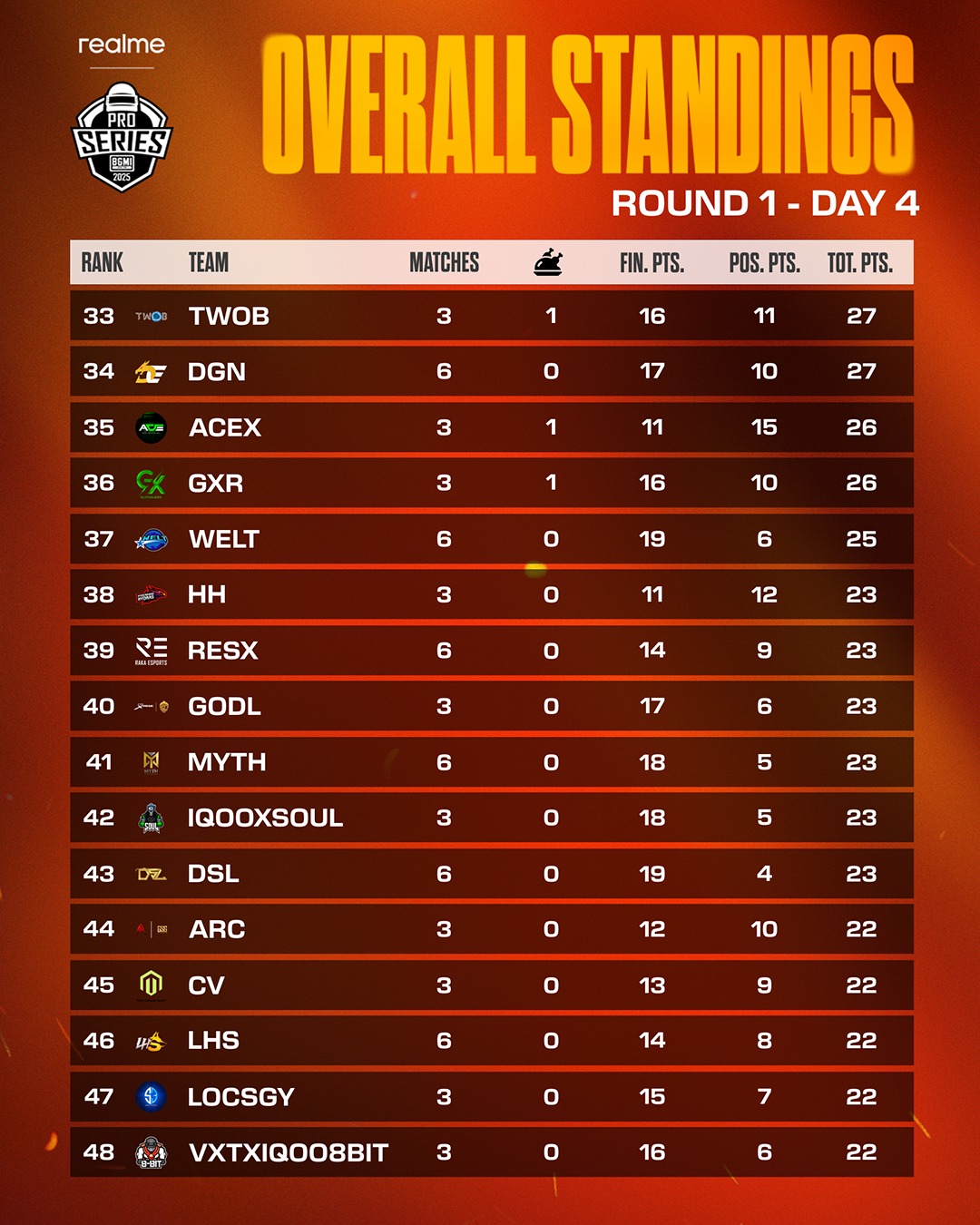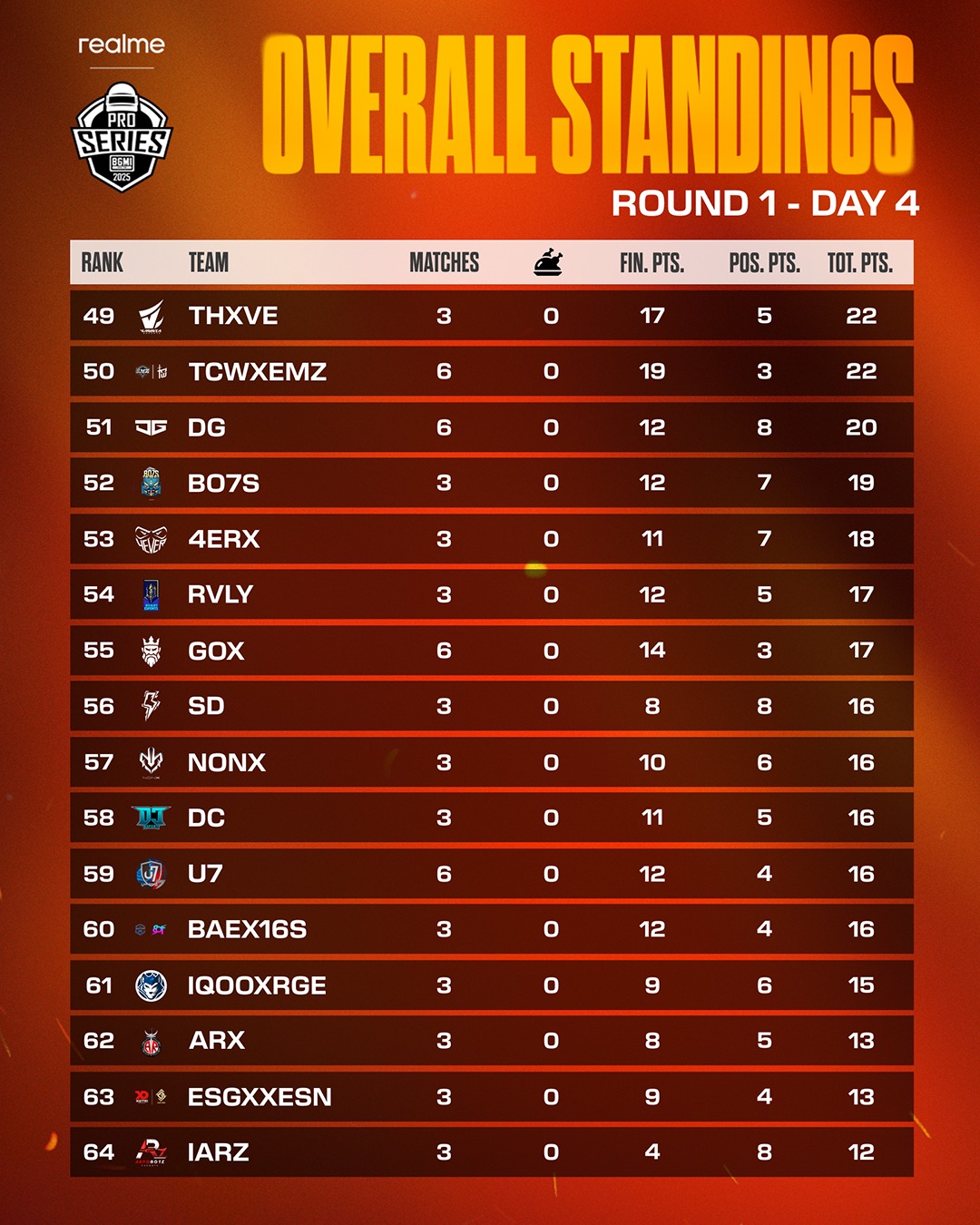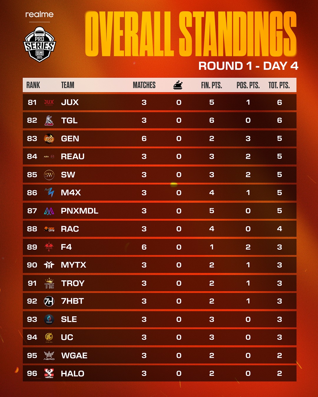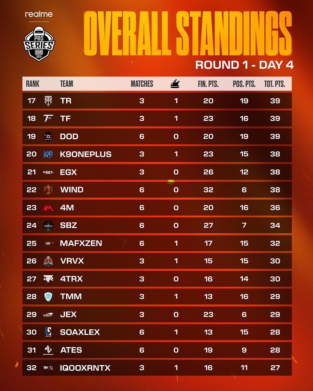 Team Tamilas improved their performance on Day 4 and jumped to the 14th spot with 40 points, including 22 eliminations. True Rippers and Team Forever grabbed 39 points each in their three matches. DOD has also earned 39 points but has played its six games. K9 Squad, led by Omega, took 38 points in their three matches.